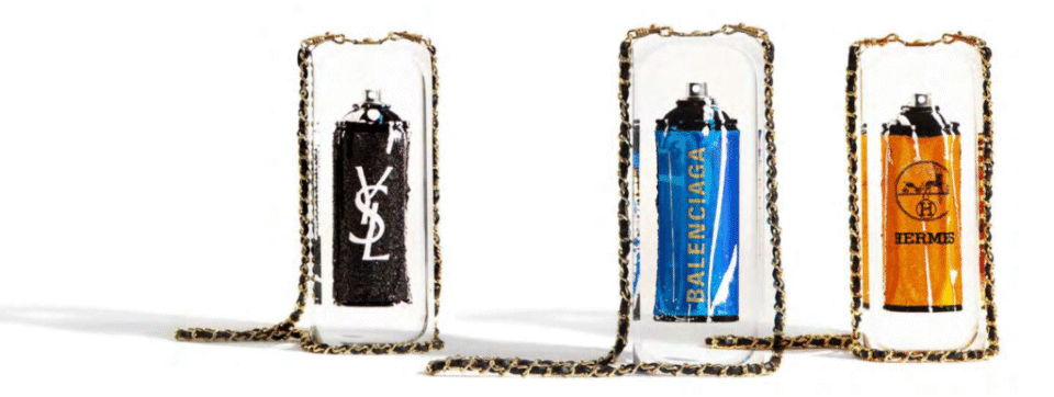 The natural evolution of paper bags were it bags, actual designer handbags painted by Fred’s hand and immortalized after a long process. Leather, suede, gold, diamond, the purity of the materials in these icons of world fashion is remarkable and made all the more stunning by their immersion in a transparent resin. Goyard, Balmain, Fendi, windowshopping becomes reality with Fred Allard’s it bags.