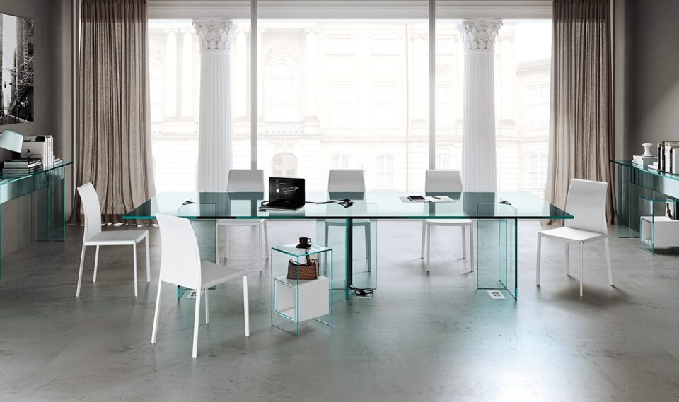 Bright Bureau en verre design haut de gamme FIAM Italia par Valerio Cometti, structure soudée en verre trempé 15 mm, design contemporain, disponible chez D-Style InteriorBright Bureau en verre design haut de gamme FIAM Italia par Valerio Cometti, structure soudée en verre trempé 15 mm, design contemporain, disponible chez D-Style Interior