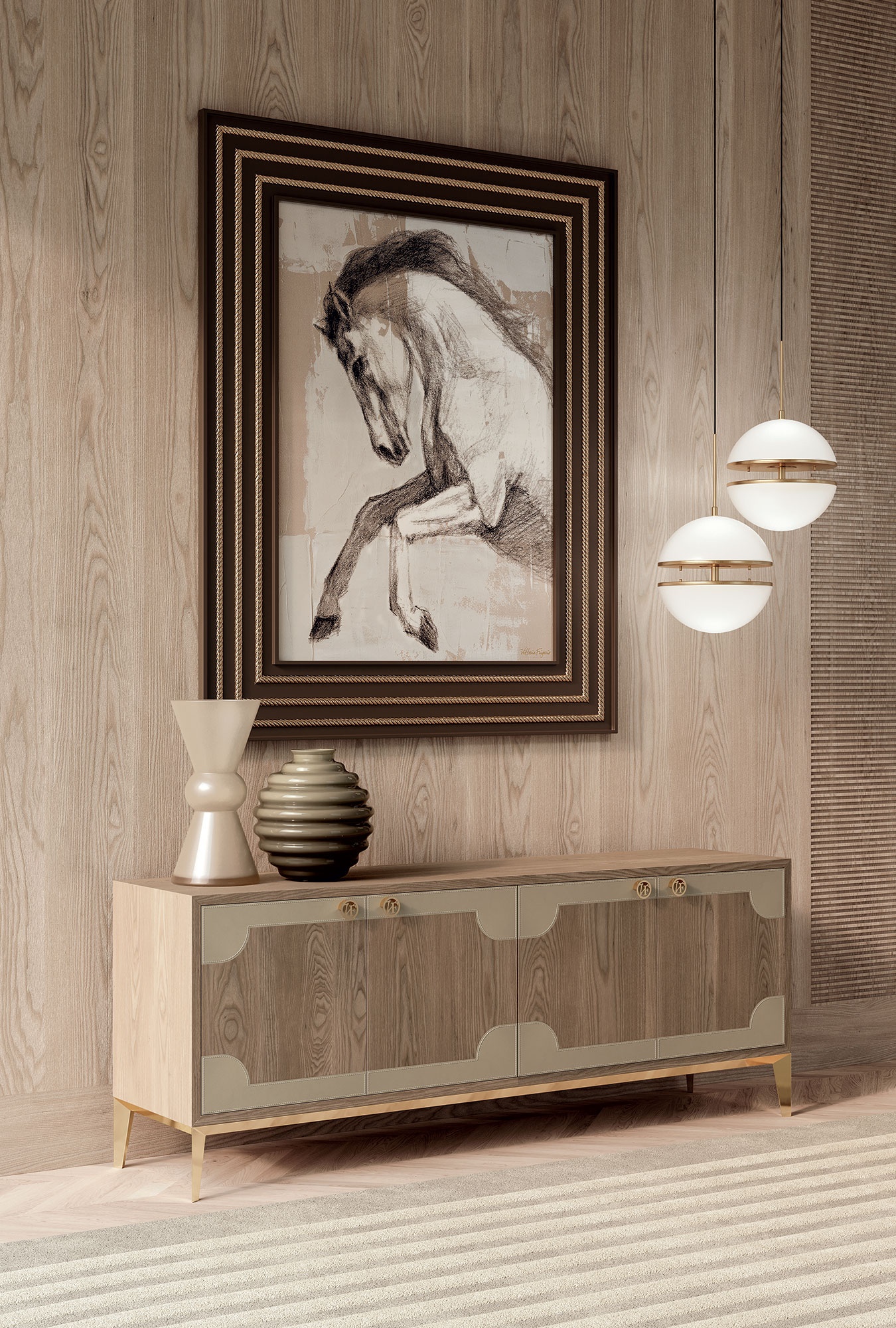 Les photos Alvi sont proposées en plusieurs dimensions, notamment 195×246 cm et 176×200 cm, permettant une grande flexibilité d’intégration selon la configuration de votre pièce. Deux styles de cadre sont disponibles. La version “A” présente une structure laquée bronze, enrichie de bordures Bronze Patiné et de décorations dorées patinées, créant une allure luxueuse et intemporelle. La version “C” se distingue par un habillage en cuir Cuoio avec surpiqûres contrastées et bords Bronze Patiné, offrant un caractère chaleureux et sophistiqué.
