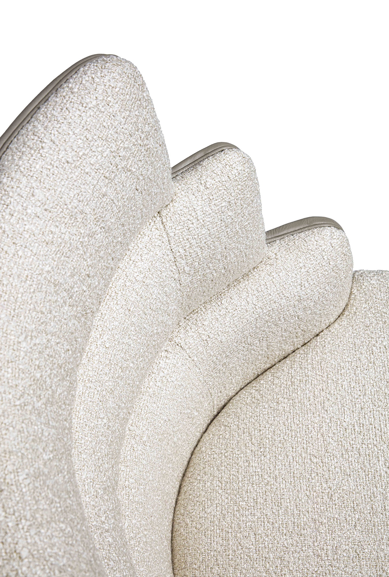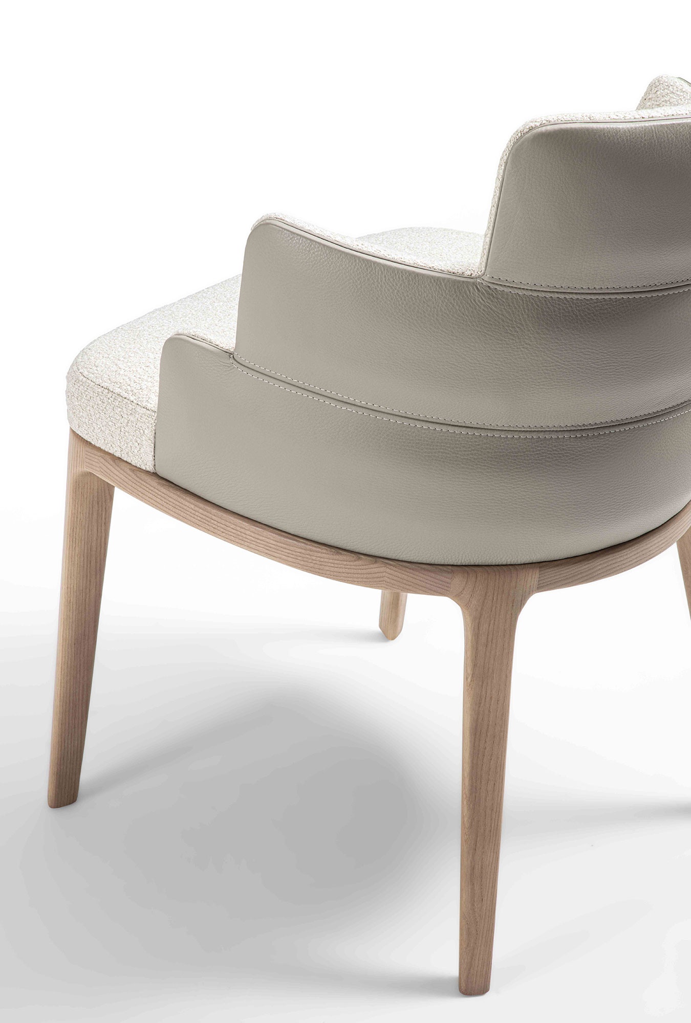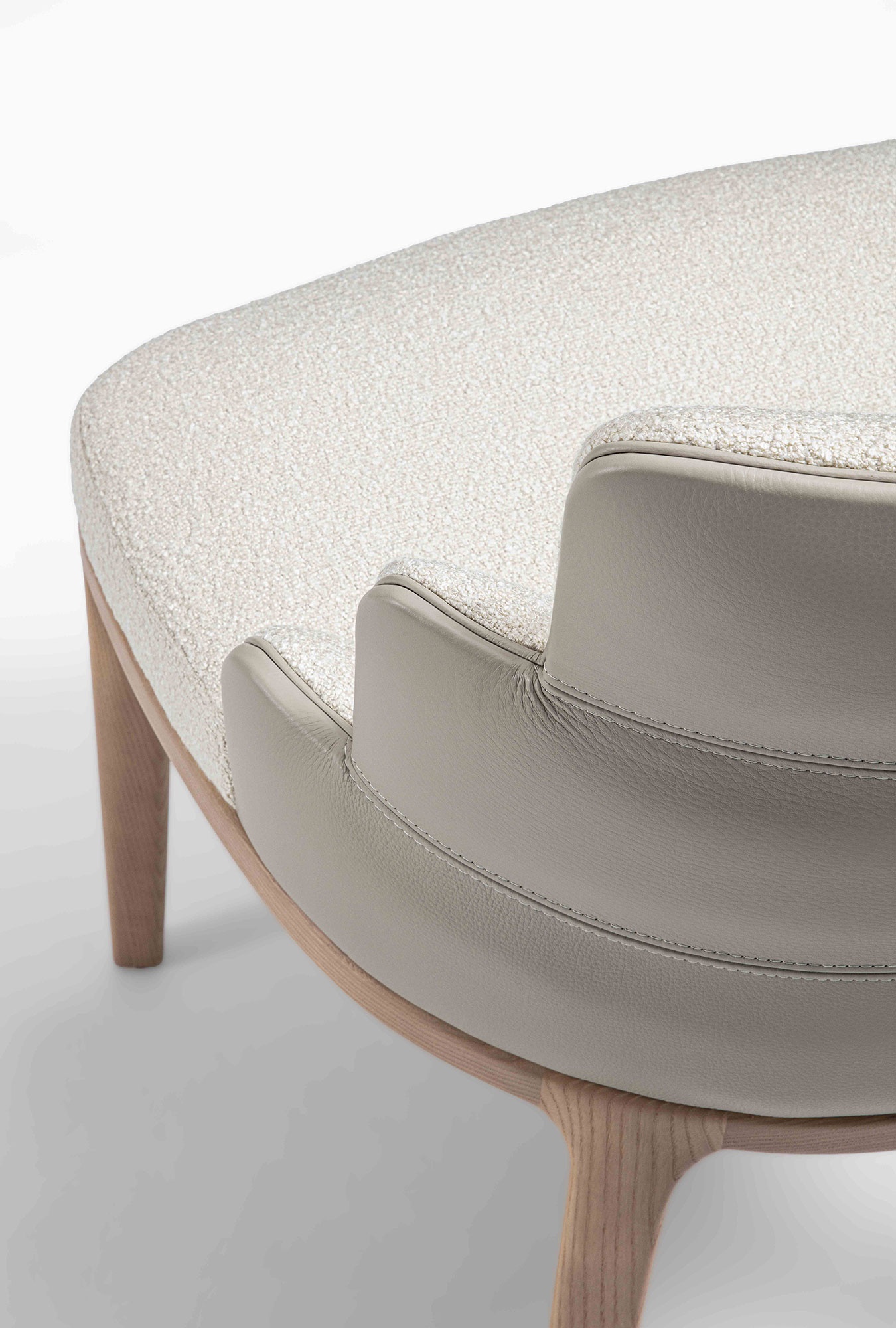 La base en frêne massif, disponible dans des teintes nobles telles que Tabac, Wengé, Sable ou Réglisse, apporte à l’ensemble une présence naturelle et intemporelle. Le revêtement fixe, proposé en tissu, cuir ou une combinaison des deux, exprime le savoir-faire distinctif de la maison Vittoria Frigerio : précision du geste, recherche des matériaux et excellence du détail.
