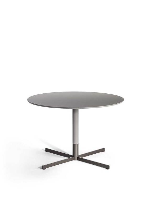 Bob Bistrot | Table basse design ronde haut de gamme est une création élégante signée Jean-Marie Massaud pour Poltrona Frau. Pensée pour les espaces contemporains et les environnements d’accueil raffinés, cette table allie sobriété, fonctionnalité et excellence des matériaux. Son design se distingue par un piètement en croix en acier bruni satiné, véritable signature visuelle de la collection.