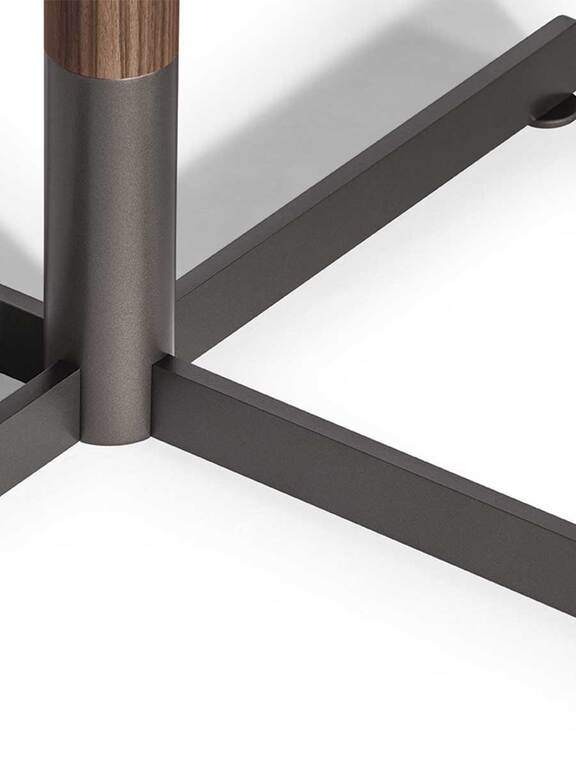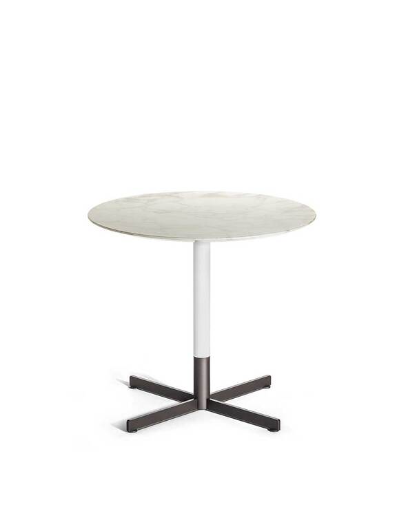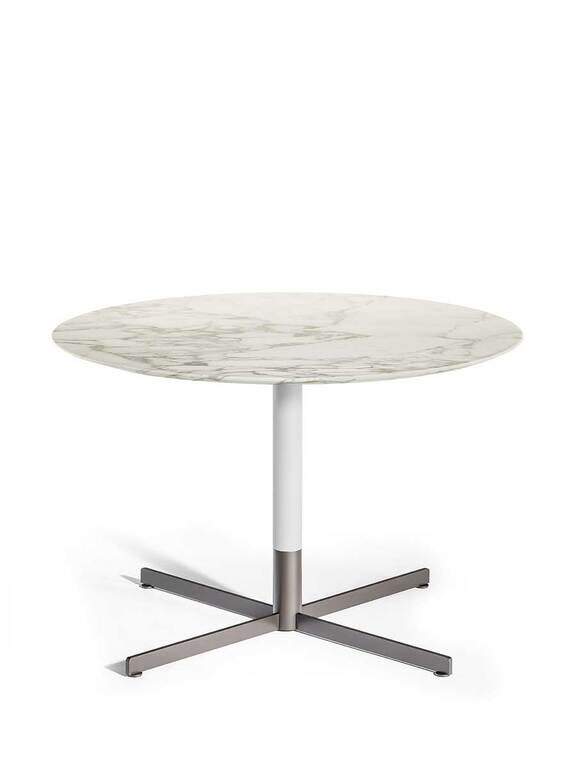 Le plateau rond est disponible dans plusieurs finitions haut de gamme : marbre Calacatta Oro pour une touche luxueuse, bois raffiné pour un rendu chaleureux, ou Fenix NTM® pour une élégance contemporaine et une résistance exceptionnelle. Chaque version exprime un équilibre subtil entre modernité et artisanat italien, avec des détails soignés tels que les patins métalliques réglables et les embouts de protection discrets.