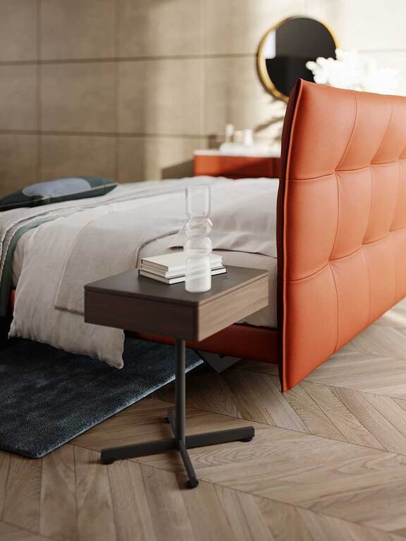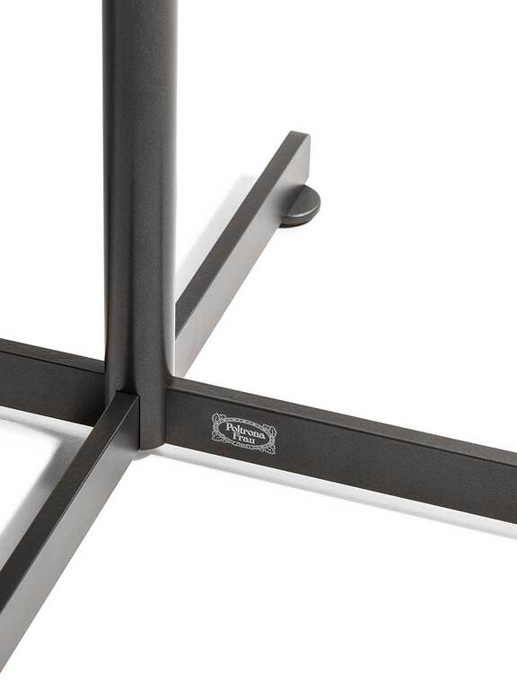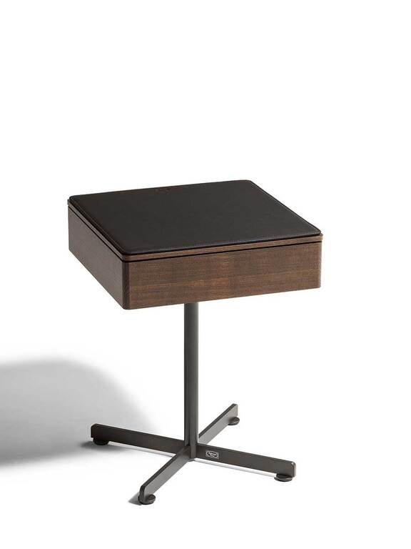 Parmi les options disponibles, un tapis antidérapant beige Alcantara permet de protéger et décorer l’intérieur du tiroir, tandis qu’un tapis en cuir Pelle Frau® légèrement rembourré, avec des coutures ton sur ton ou en contraste, peut être placé au-dessus du plateau pour un confort d’usage supplémentaire. Cette table basse design haut de gamme propose des associations sophistiquées entre le bois massif, le cuir précieux et l’acier peint pour un résultat à la fois formel et désinvolte.