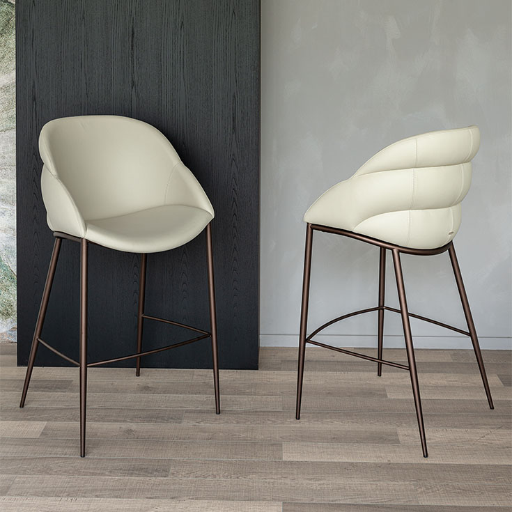 La structure en métal embossé, disponible en titanium, bronze, graphite, perle ou noir, apporte légèreté et robustesse, tandis que l’assise et le dossier peuvent être recouverts de tissu, micro nubuck ou cuir souple selon le nuancier. Le tabouret Camilla s’intègre parfaitement aux cuisines modernes et aux bars contemporains, offrant à la fois praticité et élégance raffinée. Sa variante Camilla ML, avec structure métallique plus légère, offre maniabilité et flexibilité dans l’aménagement des espaces.