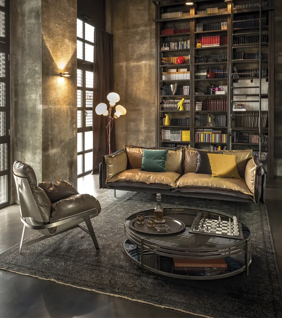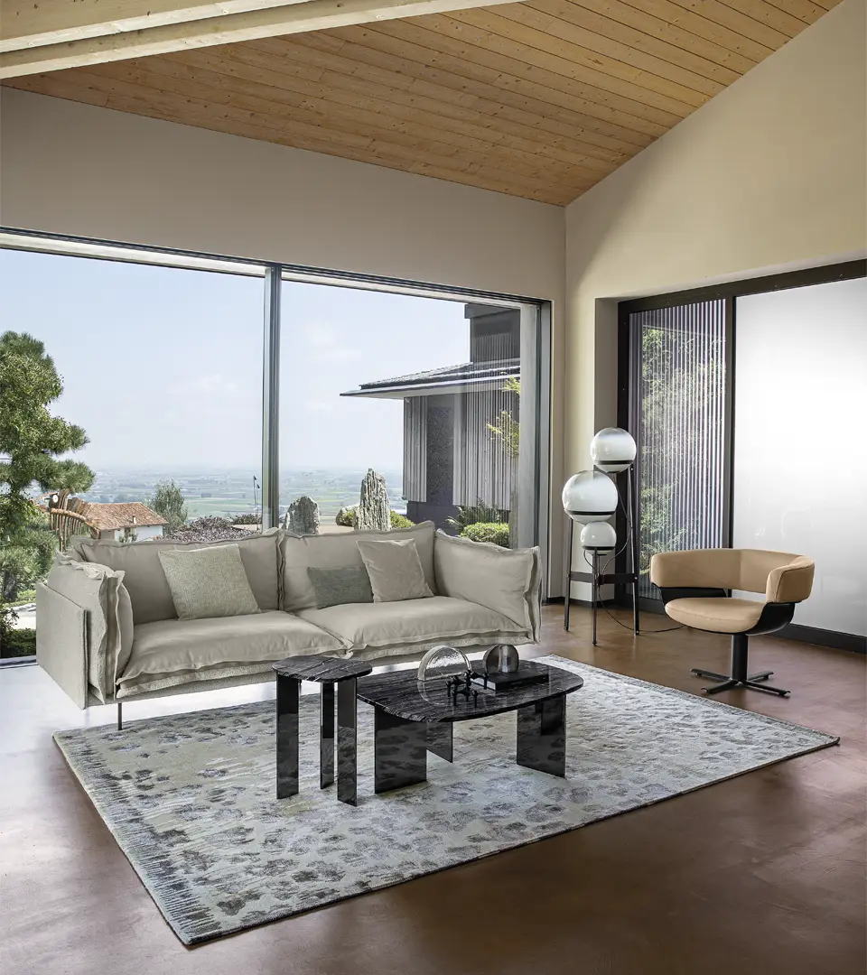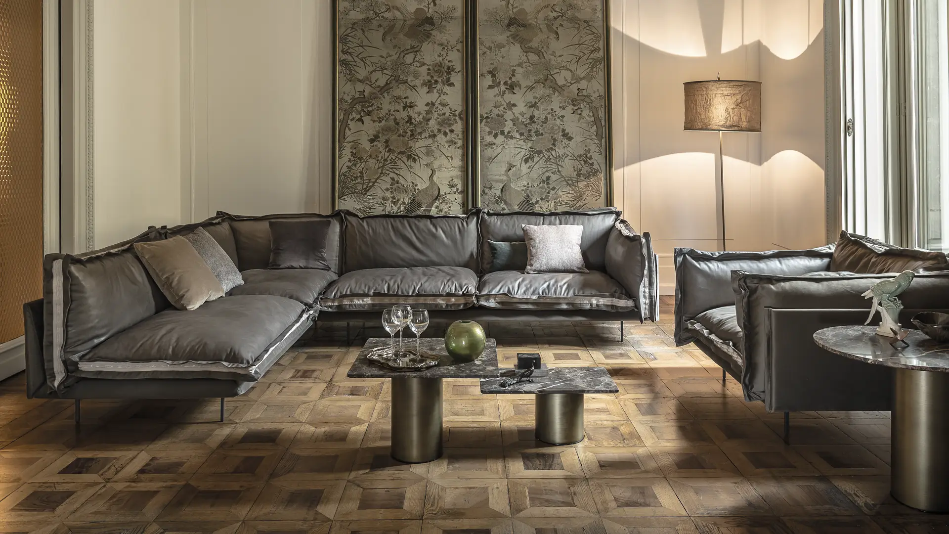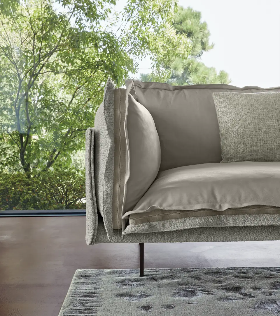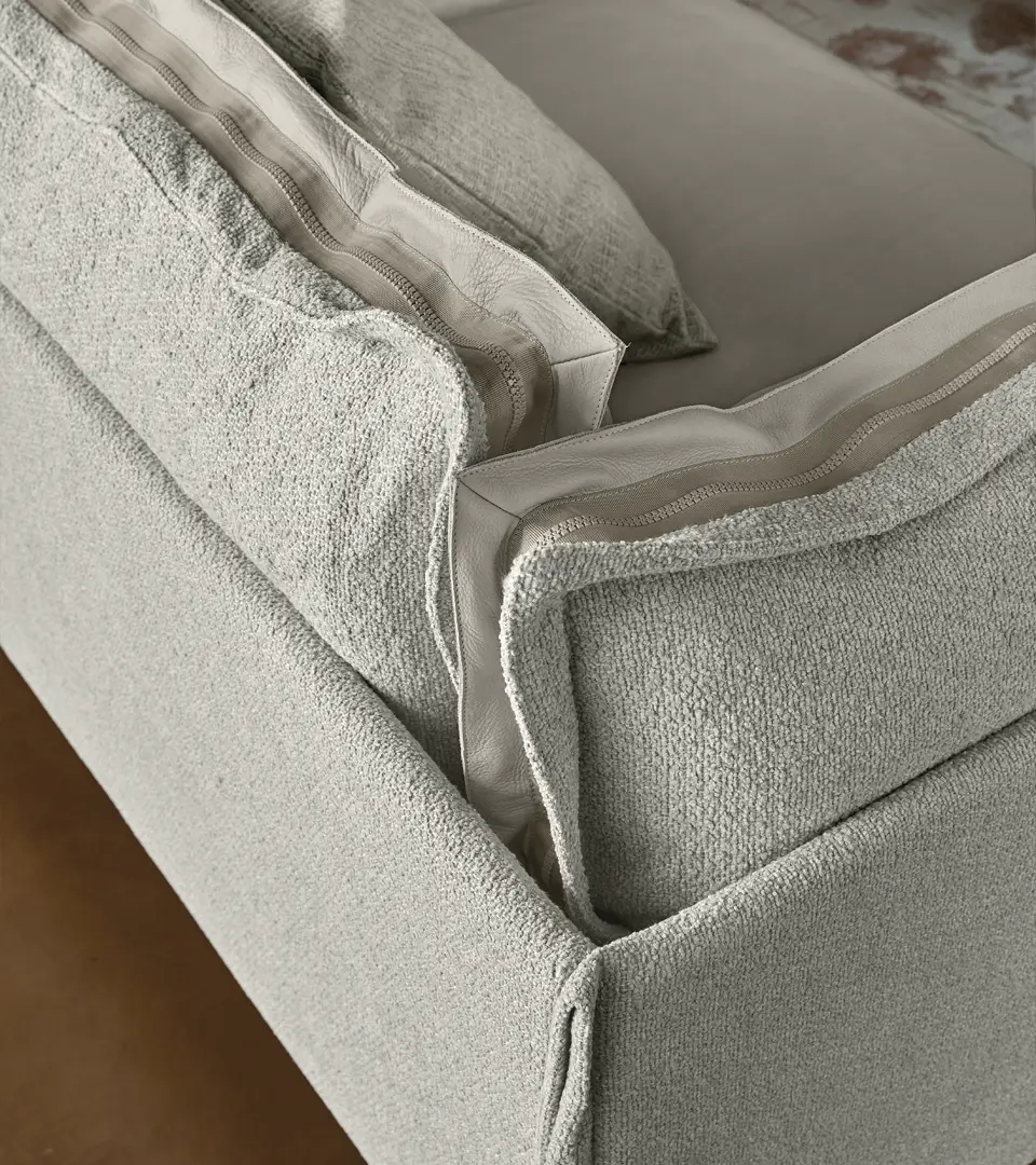 Sa particularité réside dans ses coussins dotés d’une fermeture éclair sur quatre côtés, permettant de mixer les revêtements : cuir d’un côté, tissu de l’autre. Ce système ingénieux donne naissance à d’innombrables combinaisons esthétiques, offrant à chaque espace un caractère unique et évolutif.