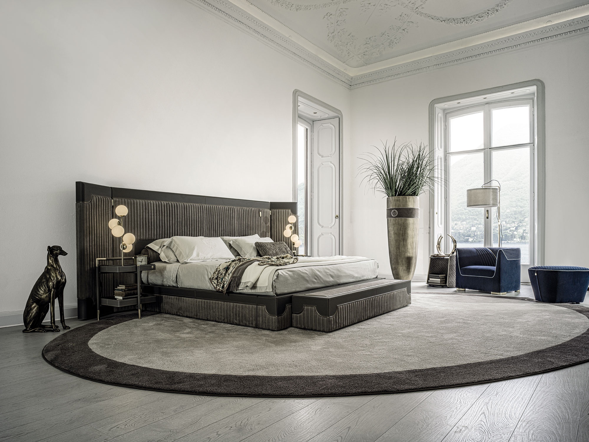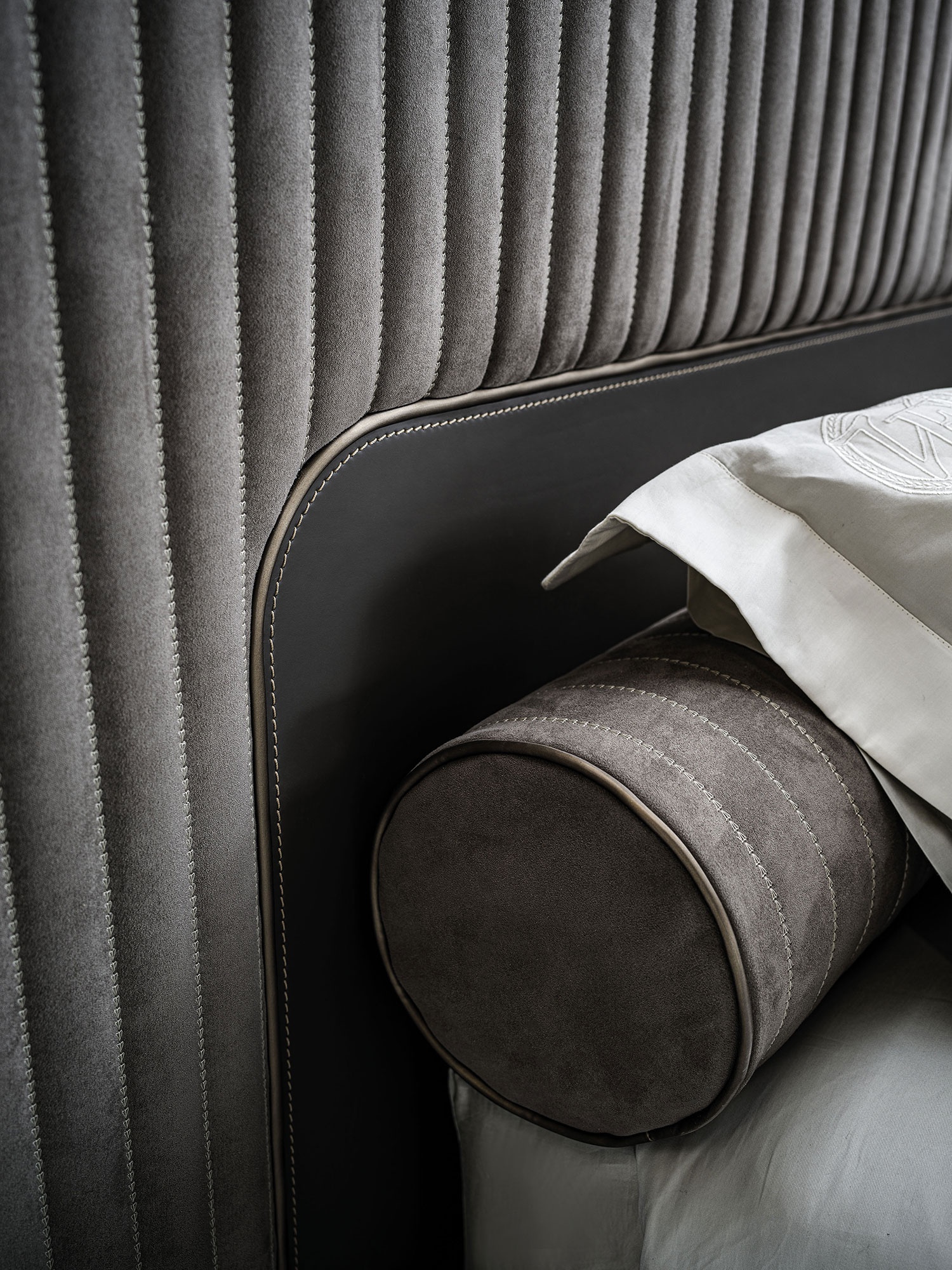 Capua lit de Vittoria Frigerio attire le regard grâce à sa tête de lit majestueuse, travaillée avec un matelassage vertical signature. Cette structure enveloppante crée une impression immédiate de confort et de présence, tout en donnant au lit une identité visuelle forte. Les bandes verticales, régulières et parfaitement dessinées, apportent un rythme élégant qui s’intègre aussi bien dans un intérieur classique que contemporain. Elles encadrent le lit avec naturel, créant un volume généreux qui devient rapidement l’élément central de la chambre.