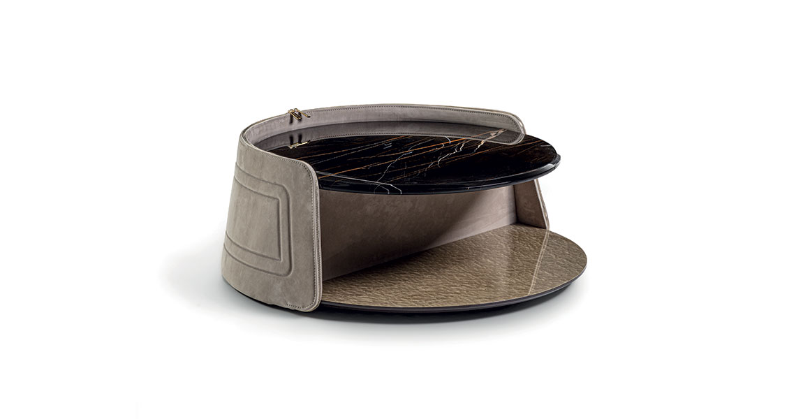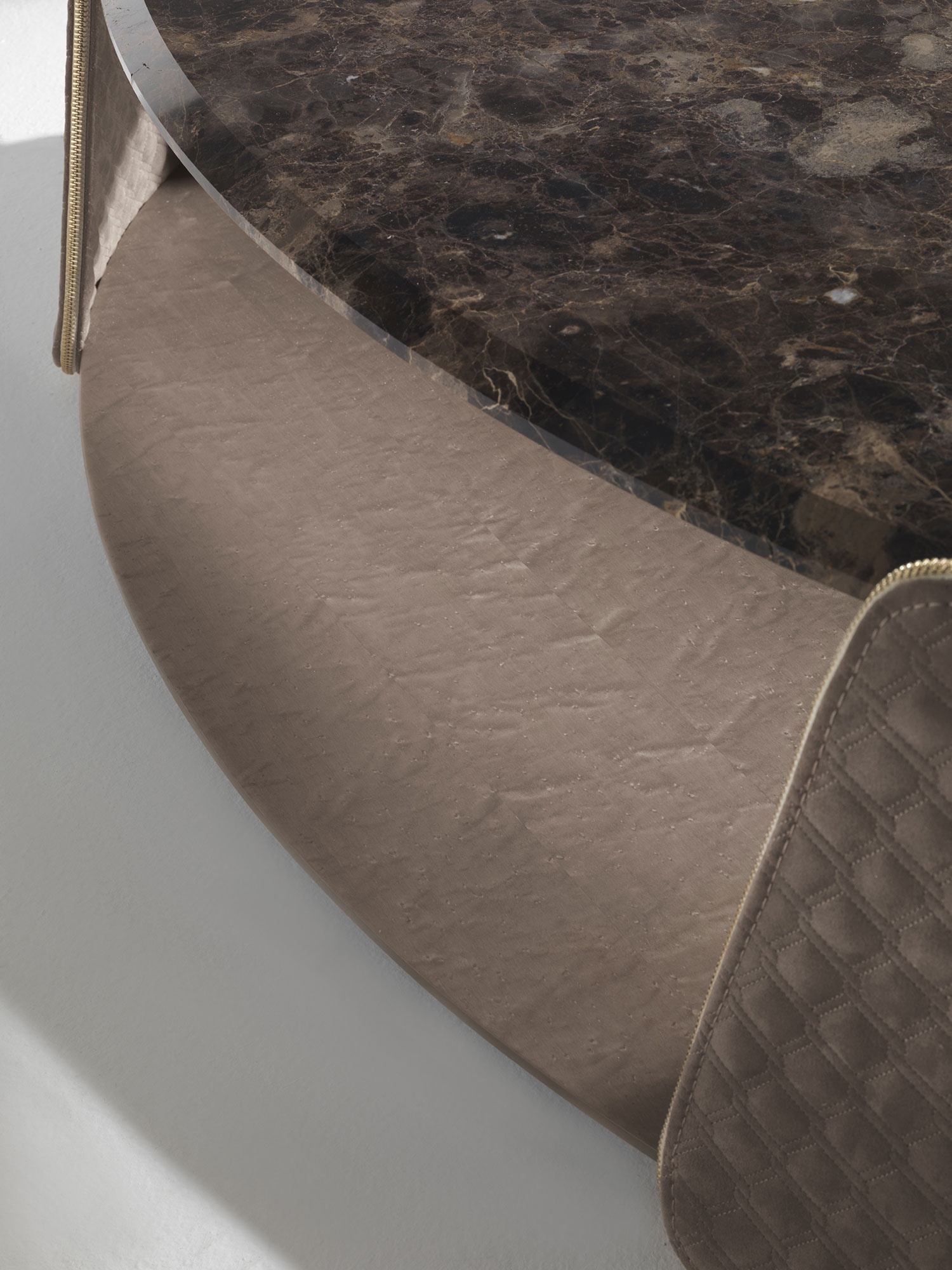 Contarini table basse de Vittoria Frigerio incarne l’élégance raffinée et le savoir-faire couture qui caractérisent la Maison. Cette pièce se distingue par la richesse de ses finitions et par la possibilité de combiner différents matériaux, marbres, bois, tissus ou cuirs pour créer une configuration véritablement unique. Contarini existe en deux versions : une première avec une structure en métal habillée de tissu ou de cuir et ornée d’un matelassage soigné, et une seconde dotée d’un motif embossé exclusif. Les parties cousues sont mises en valeur par une fermeture éclair décorative en finition or brillant, avec une option noir brillant disponible sur demande.