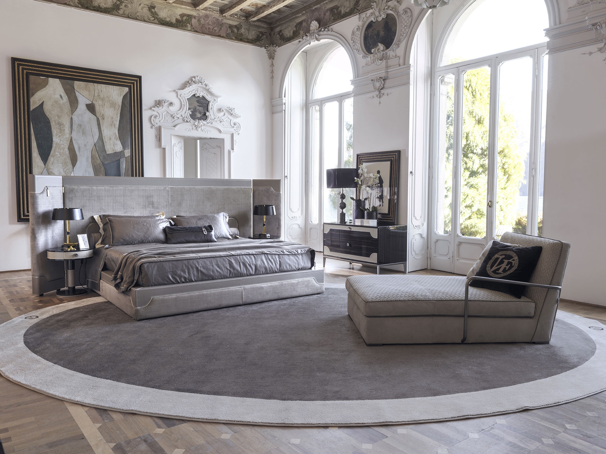 Corio lit de Vittoria Frigerio se distingue par une présence forte et raffinée, pensée pour devenir l’élément central de la chambre. Son imposant dossier, inspiré par l’esthétique des paravents, crée une véritable structure architecturale qui redéfinit l’espace nuit. Les panneaux du dossier sont soigneusement habillés de tissu ou de cuir, tandis que des inserts en cuir Cuoio soulignent la largeur et apportent une signature visuelle élégante.