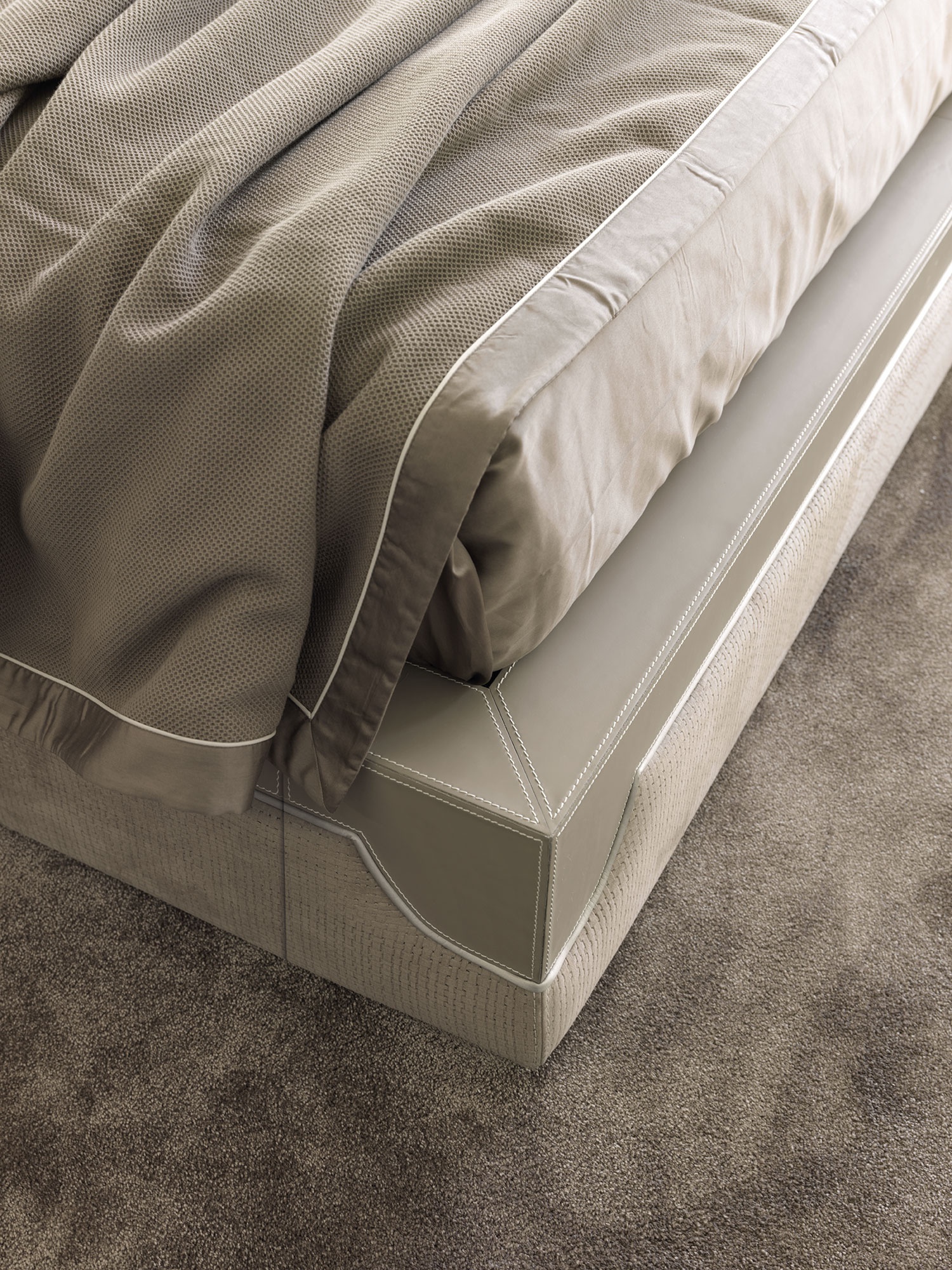 Le cadre du lit reprend cette même rigueur esthétique. Ses lignes droites et équilibrées sont soulignées par des finitions en cuir, créant une continuité harmonieuse avec la tête de lit. Chaque détail exprime un savoir-faire italien d’exception, depuis la qualité du rembourrage jusqu’à la précision des coutures en contraste. La structure repose sur des pieds noirs discrets, apportant stabilité et légèreté à l’ensemble.