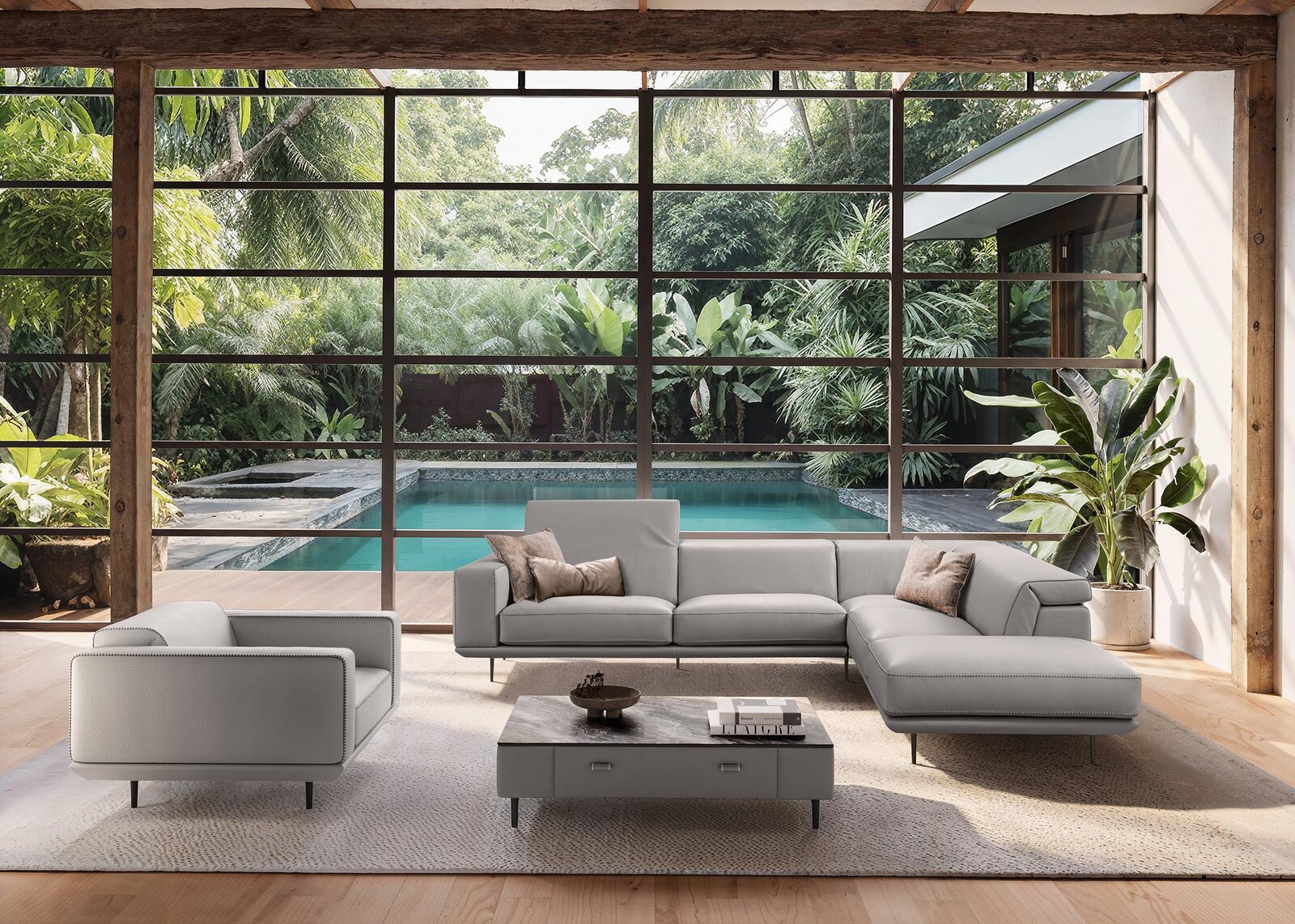 Le travail artisanal est mis en valeur par des coutures raffinées le long des bords et de larges panneaux de cuir qui soulignent la beauté naturelle du matériau. Cette minutie dans la confection fait du Denny un canapé aussi esthétique que durable. Les options de personnalisation permettent de jouer avec les couleurs et les textures pour créer des compositions bicolores ou ton sur ton, selon l’ambiance souhaitée. Chaque détail, jusqu’aux pieds contemporains disponibles en plusieurs finitions, renforce le caractère exclusif de ce modèle.