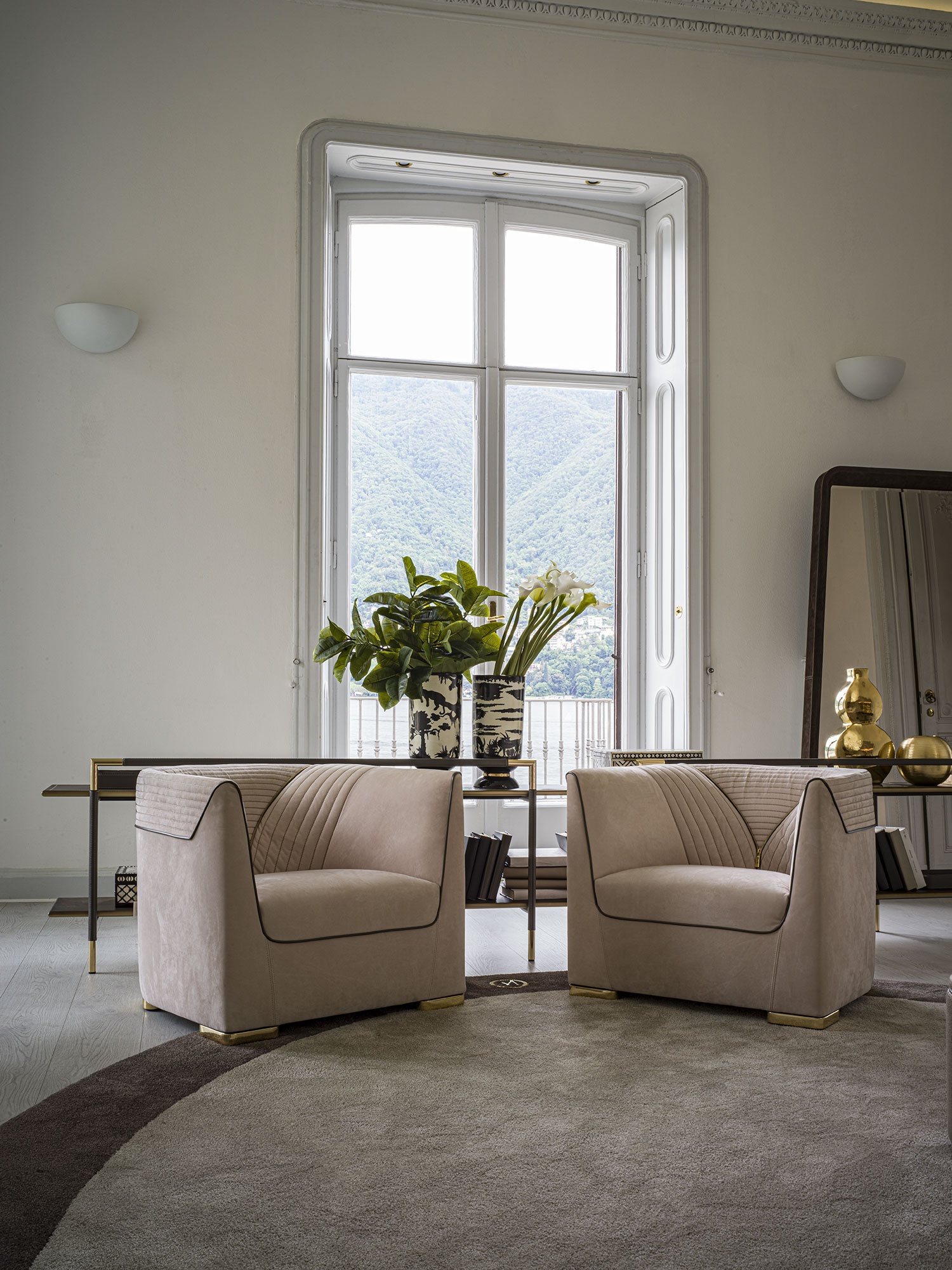 Le design se distingue par la diagonale délicate des accoudoirs qui fusionnent avec le dossier le long d’une ligne ininterrompue, créant un effet visuel de dynamisme et de continuité. La partie interne et supérieure du dossier est ornée d’une broderie exclusive, mise en valeur par une fermeture éclair disponible en finition dorée ou noire brillante. Le passepoil simple souligne l’ensemble avec subtilité, renforçant l’aspect raffiné et artisanal du fauteuil. Les pieds, proposés en finition glossy or ou bronze, complètent le design et ajoutent une touche de sophistication.