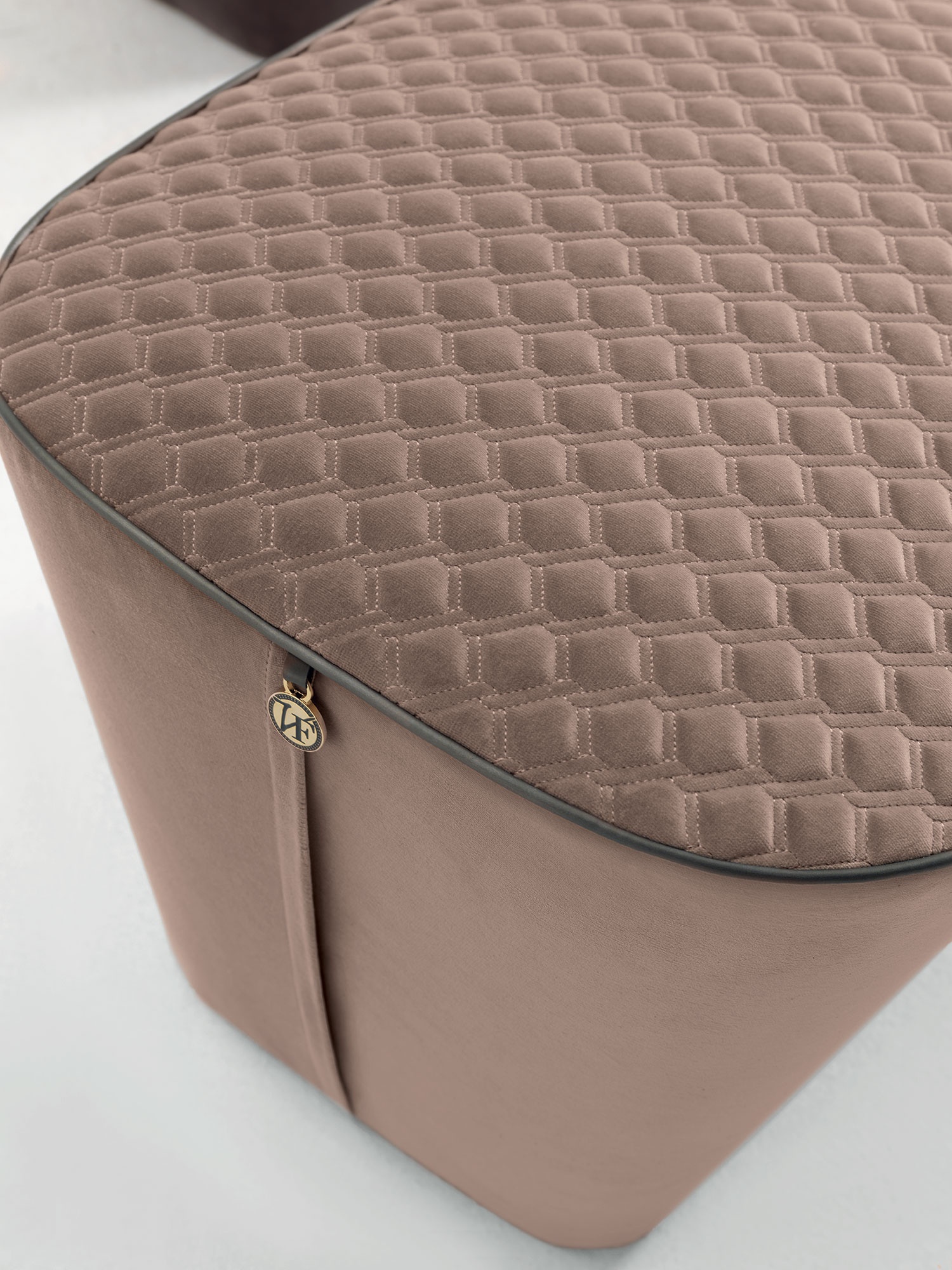 La partie supérieure est décorée d’un matelassage dédié qui apporte du relief au design. Le passepoil, proposé ton sur ton ou en contraste, souligne les lignes du modèle de façon délicate et élégante. Un bouton orné du logo VF complète la finition et affirme le caractère exclusif de la pièce. Ce soin du détail est emblématique de Vittoria Frigerio, où chaque élément contribue à l’harmonie du produit.