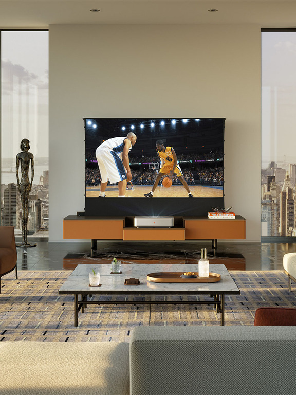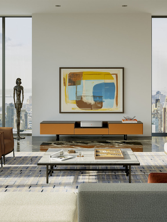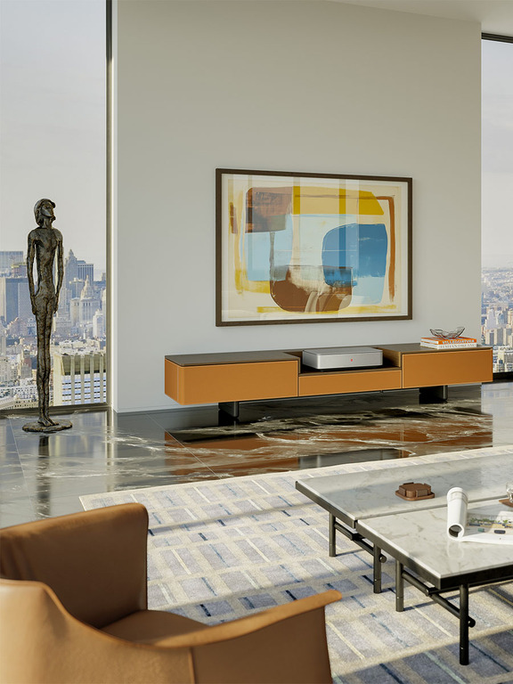 La structure en frêne massif et multiplis de bouleau plaqué frêne révèle un intérieur en érable extra clair, tandis que le plateau supérieur dissimule un écran de projection motorisé à montée verticale de 100 pouces. Le compartiment central dédié au Leica Cine 1, équipé d’une optique à ultra courte focale et de la technologie laser RGB triple, projette des images en résolution 4K avec un rendu chromatique impeccable et un système audio Dolby Atmos®. Avec la toile complètement relevée, le meuble atteint des dimensions impressionnantes de 280 cm de largeur.