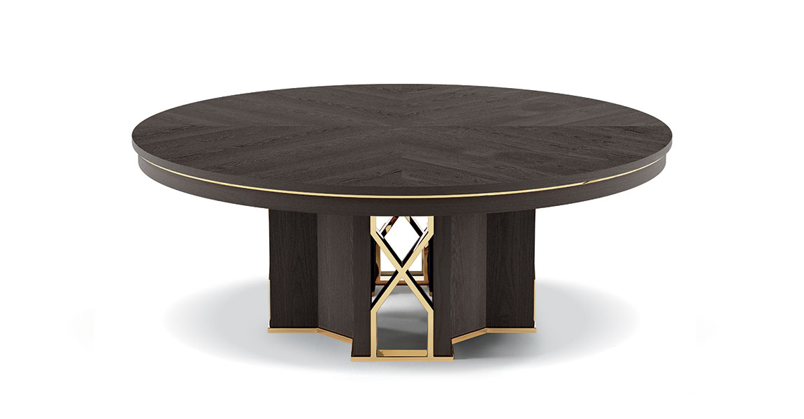 Grimaldi table de Vittoria Frigerio se distingue par sa présence affirmée et son esthétique luxueuse. Conçue pour apporter du caractère à un espace, elle joue sur des proportions solides et sur le contraste entre les matériaux. Sa structure en bois précieux, disponible en érable brillant ou mat ainsi qu’en frêne dans différentes teintes, crée une base élégante et chaleureuse. Les inserts métalliques intégrés dans le plateau et les pieds apportent une touche raffinée et renforcent l’identité haut de gamme du modèle.