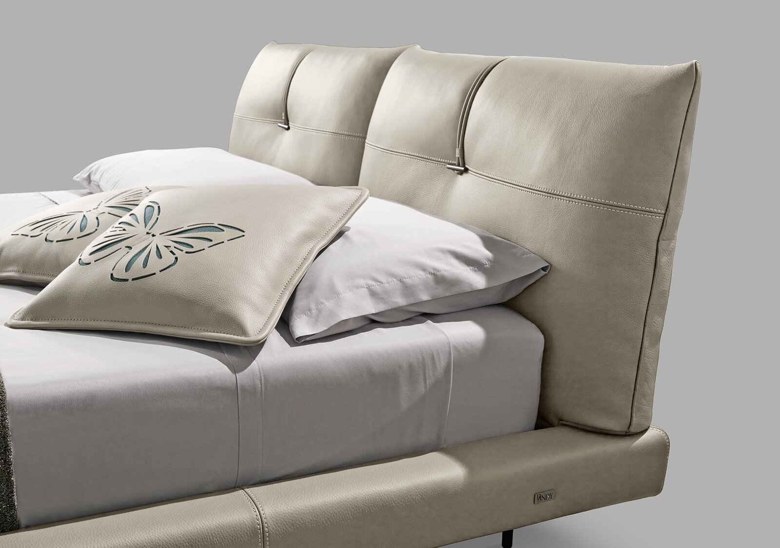 Le dossier est orné de coutures linéaires précises et de deux sangles en cuir maintenues par un fermoir chromé, soulignant les détails artisanaux et la créativité du design italien. Ces finitions soignées confèrent au lit un aspect métropolitain et élégant, tout en offrant un confort optimal pour la lecture ou la détente.