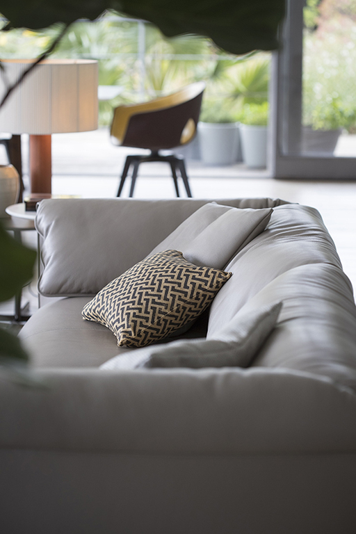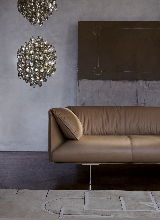 La structure en hêtre massif avec traverse centrale en fer supporte un système d’assise perfectionné utilisant des sangles élastiques pour une suspension optimale. Les coussins, rembourrés en douces plumes d’oie et gainés de cuir Pelle Frau® micro-perforé, s’adaptent naturellement aux mouvements du corps pour une sensation moelleuse et enveloppante. Le dossier et les accoudoirs, en hêtre et peuplier massifs avec panneaux en multiplis, offrent un maintien parfait tout en conservant une esthétique légère.