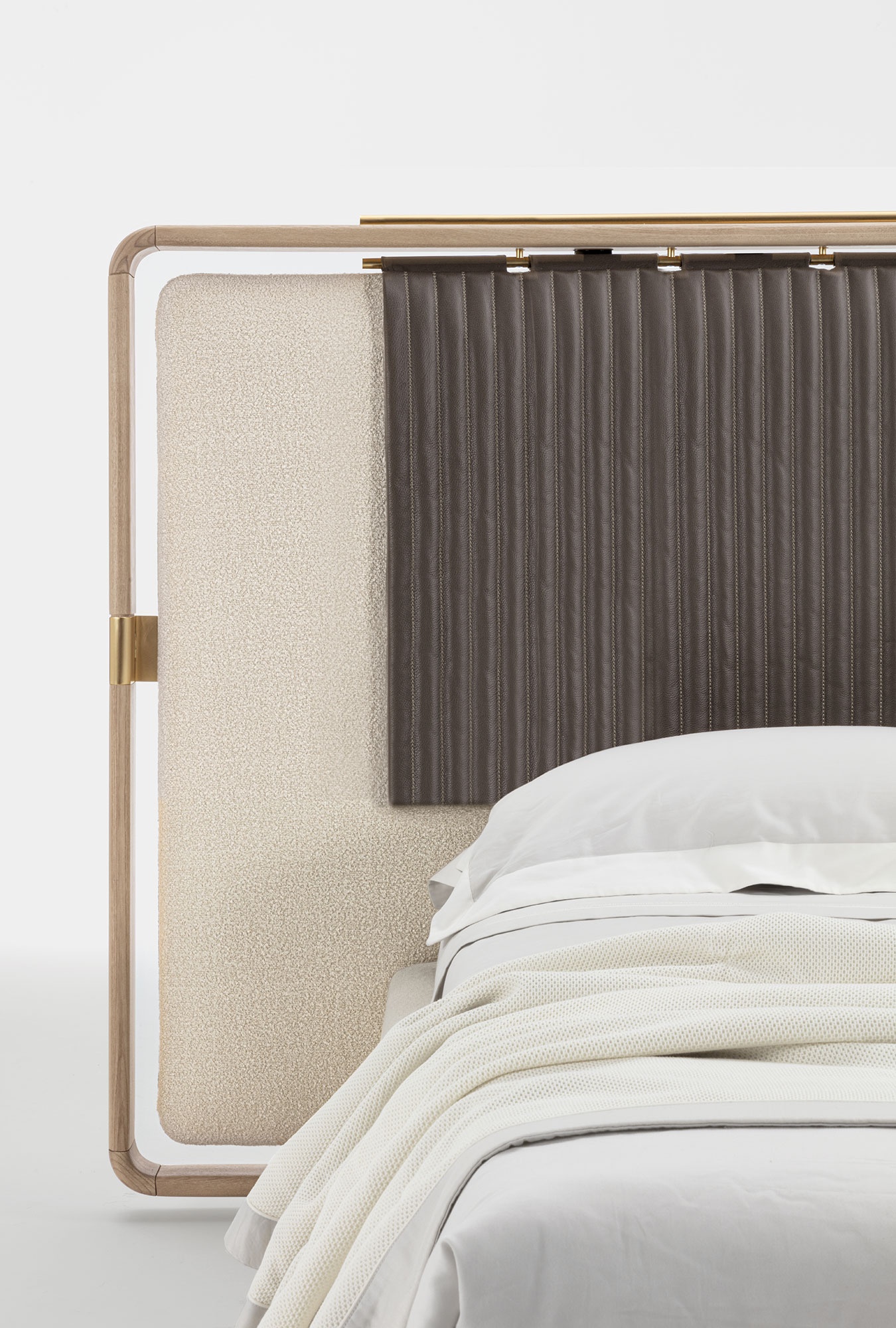 Lario lit de Vittoria Frigerio se distingue par une silhouette architecturale et un sens affirmé du détail. Sa structure remet au goût du jour une élégance intemporelle, en jouant sur la pureté des lignes et la combinaison de matériaux nobles. La tête de lit, particulièrement imposante, est encadrée d’une structure en bois qui accueille un panneau central rembourré. Disponible en tissu ou en cuir, ce panneau semble suspendu grâce à de subtils éléments métalliques dorés, créant un effet visuel raffiné et contemporain. Dans la version Quilt, l’insert capitonné verticalement apporte une texture supplémentaire et renforce le caractère décoratif de l’ensemble.