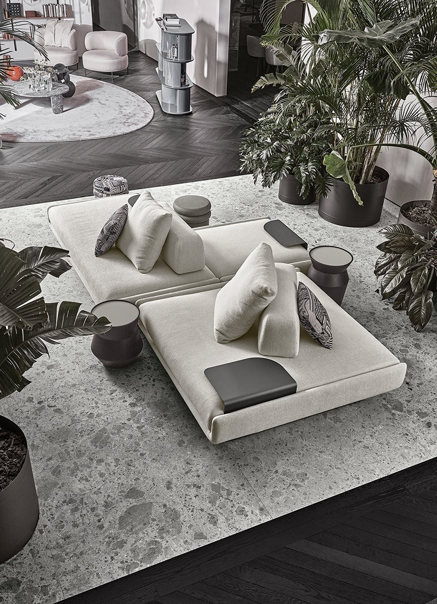 Le canapé design Lilas Mosaïque permet de composer des îlots, méridiennes ou canapés d’angle grâce à des modules aux dimensions variées. Des tables d’appoint laquées « fango » et des coussins 55×55 cm complètent la collection pour un salon cohérent et haut de gamme. Ce canapé design optimise l’espace et la circulation avec une lecture contemporaine.