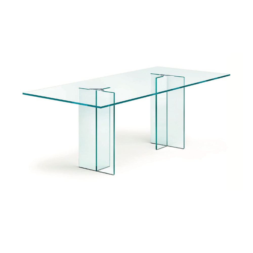 Le plateau en verre transparent de 19 mm repose sur un piétement en verre soudé, offrant à la fois robustesse et légèreté visuelle. Des trous pour le passage des câbles sont intégrés afin de maintenir un espace de travail organisé et ergonomique.