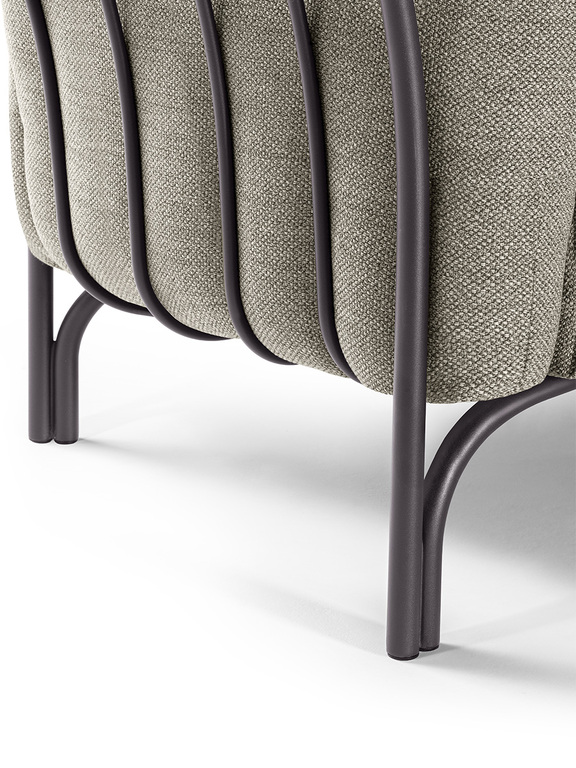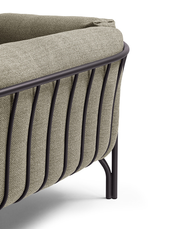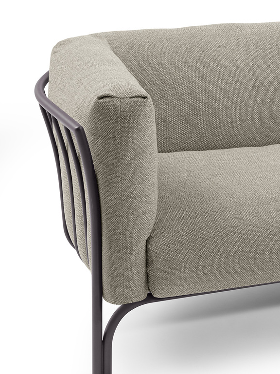 Le cadre en aluminium laqué embossé, particulièrement léger et facile à déplacer, est ponctué de fins éléments métalliques qui créent un rythme visuel élégant – plus épais sur les accoudoirs, plus espacés sur le dossier. Les coussins d’assise, de dossier et d’accoudoirs sont reliés à la structure par des sangles permettant un positionnement et un retrait rapides. Les coussins d’assise en matériau drainant et les housses entièrement déhoussables en Pelle Frau® Outdoor ou tissu Outdoor garantissent confort et praticité.