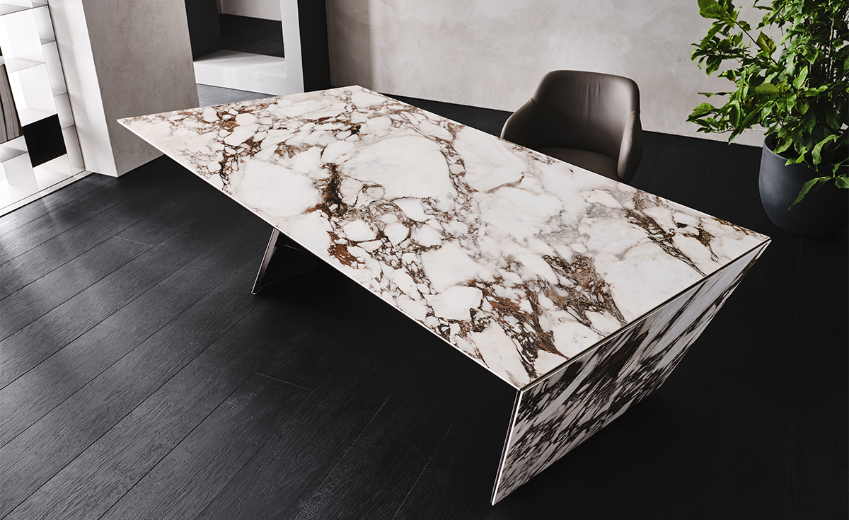 Le plateau et le côté du bureau sont réalisés en céramique Marmi, disponibles dans une large sélection de finitions prestigieuses, telles que Golden Calacatta, Portoro, Sahara Noir, Breccia ou Borghini Calacatta, soulignant la continuité des veines entre les surfaces. Le pied en acier laqué gaufré, proposé en graphite, bronze ou titane, renforce le caractère architectural du design.