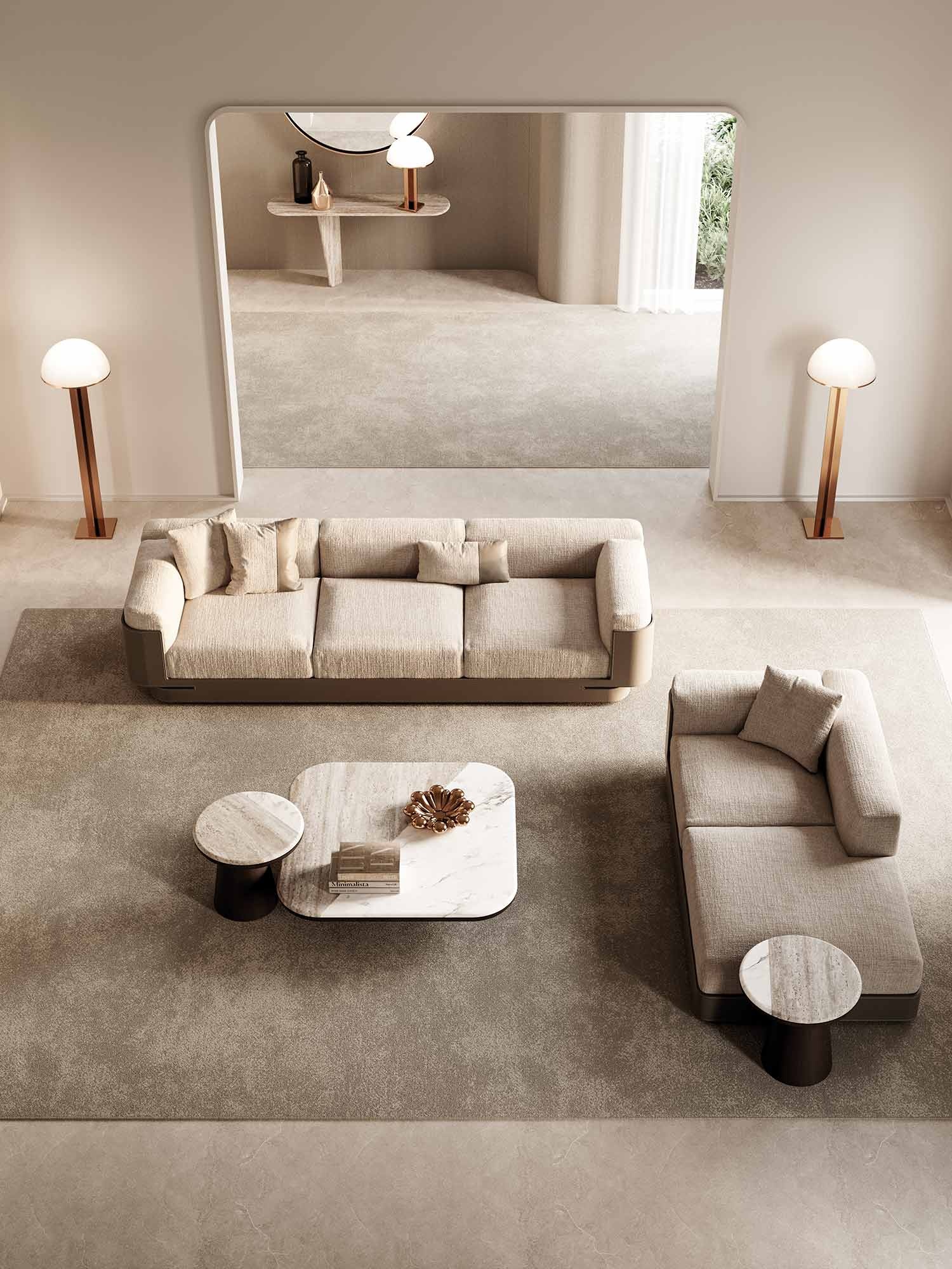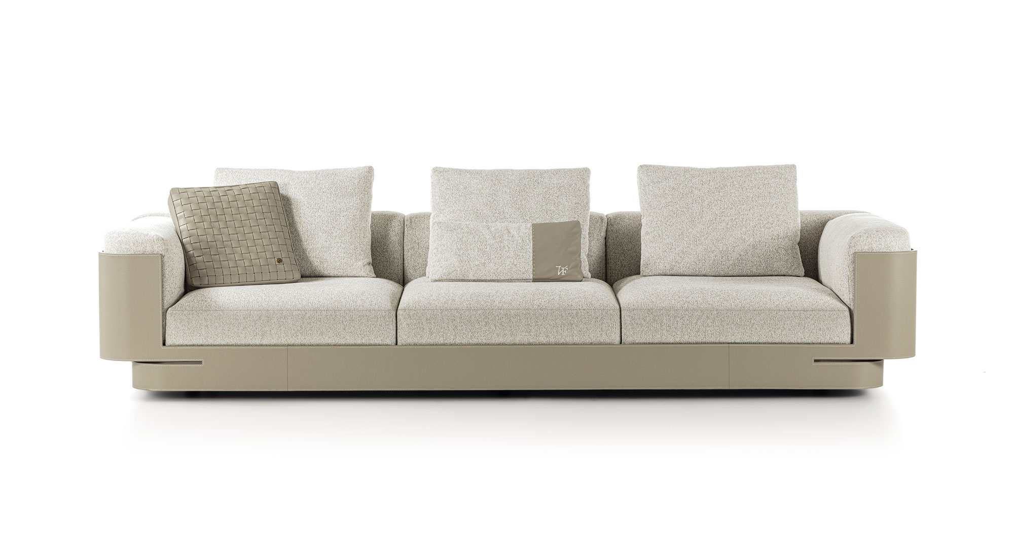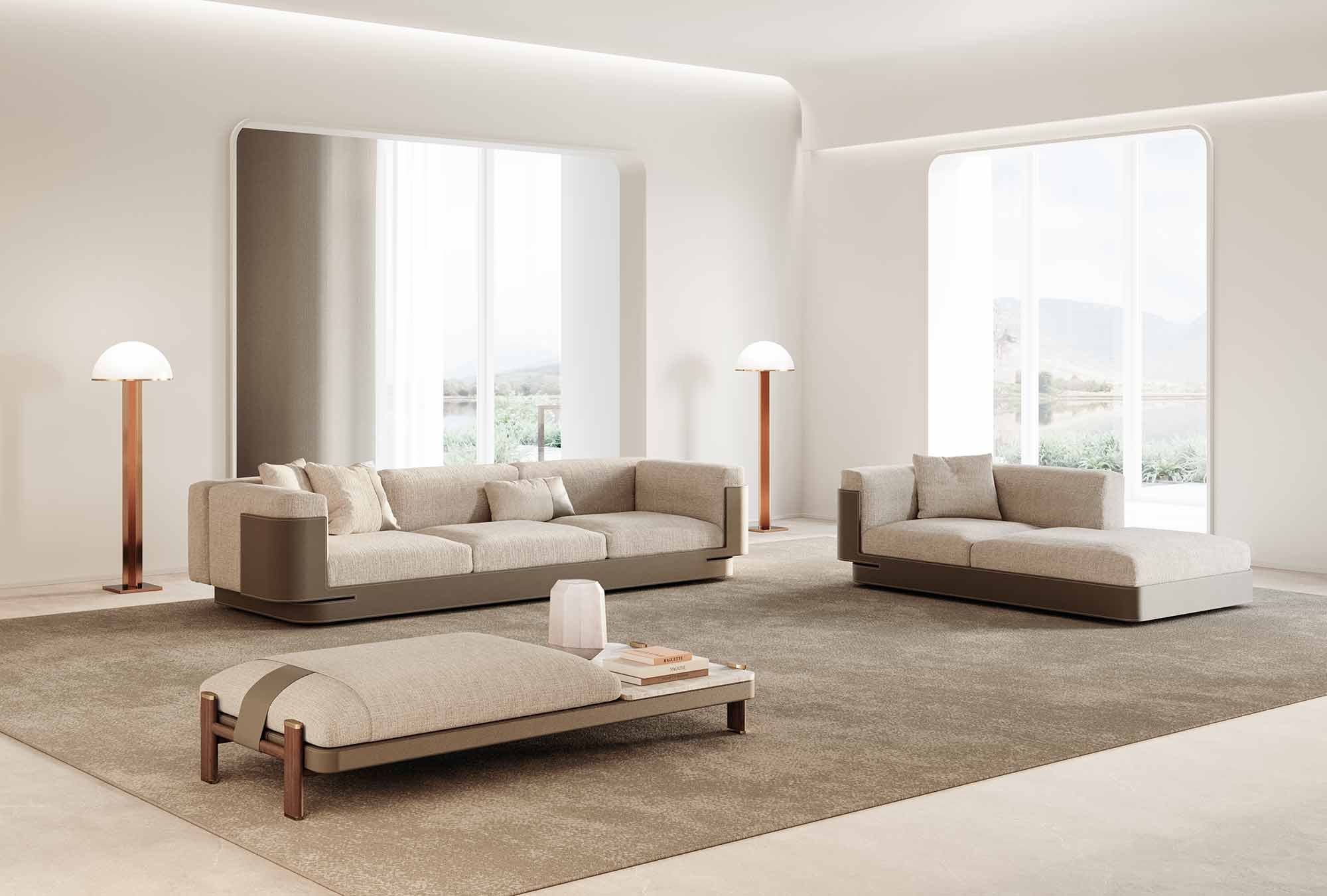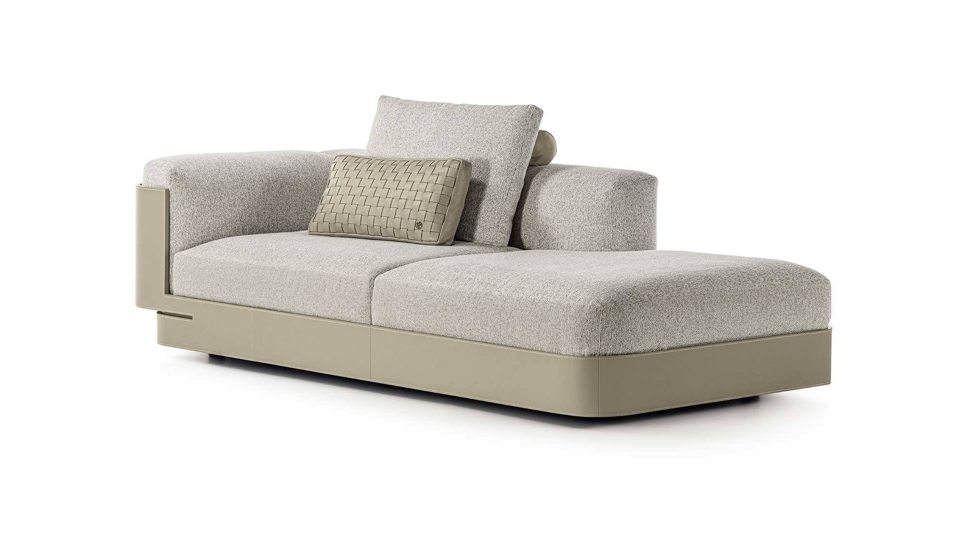Le canapé Necchi de Vittoria Frigerio, conçu par Andrea Bonini, incarne l’union parfaite entre rigueur architecturale et sensualité des formes. Ce canapé modulaire se distingue par une base géométrique marquée, revêtue de cuir, qui s’étend jusqu’à l’avant des accoudoirs, formant une enveloppe harmonieuse où volumes et matières se rencontrent avec élégance. Son allure contemporaine traduit une maîtrise exceptionnelle du design italien, où chaque ligne exprime équilibre et raffinement.