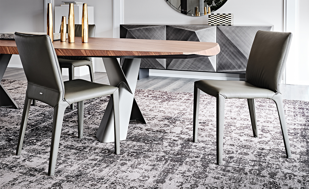 Le dossier est entièrement recouvert et rehaussé d’un élégant passepoil couleur gris canon, soulignant la silhouette de la chaise avec subtilité et modernité. Le soin apporté aux finitions et aux détails reflète l’excellence artisanale italienne, faisant de chaque chaise PENELOPE un objet design à la fois fonctionnel et esthétique.