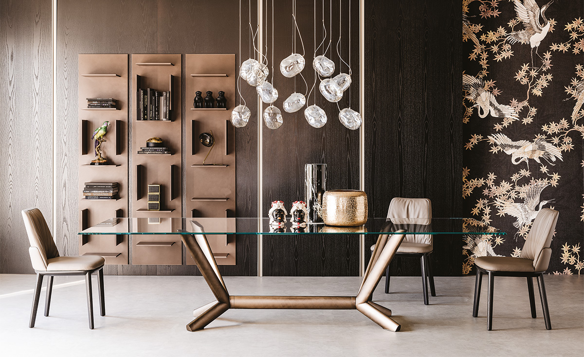 Table design haut de gamme aux lignes obliques et base en acier laqué, symbole du savoir-faire italien et d’une élégance intemporelle. Disponible chez D-Style Interior.