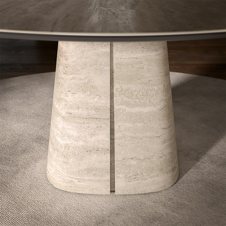 Le plateau et la base, entièrement réalisés en céramique Marmi, se déclinent dans une sélection de finitions raffinées telles que Portoro mat, Borghini Calacatta, Colosseo ou Invisible mat. Ces nuances, inspirées des marbres naturels, offrent des jeux de lumière subtils et un rendu minéral fascinant. Chaque pièce, avec ses variations chromatiques et irrégularités propres à la céramique travaillée à la main, est unique.