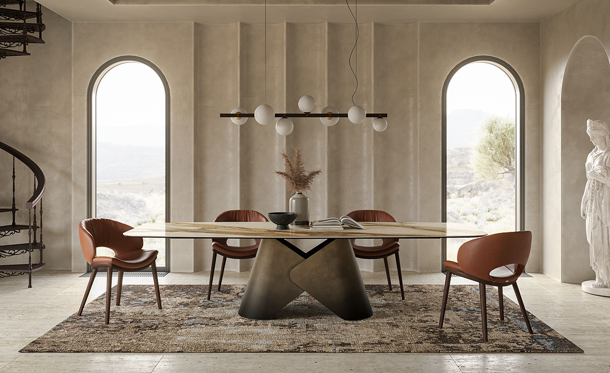 Scott Keramik de Cattelan Italia incarne l’union parfaite entre art sculptural et design contemporain. Véritable œuvre d’architecture, cette table design haut de gamme séduit par son esthétique saisissante et la pureté de ses lignes. Sa base centrale, composée de deux plaques métalliques courbées et superposées, évoque le col d’une chemise, symbole d’élégance et de structure. Chaque courbe, chaque arête est travaillée avec une précision exceptionnelle, témoignant du savoir-faire italien le plus raffiné.