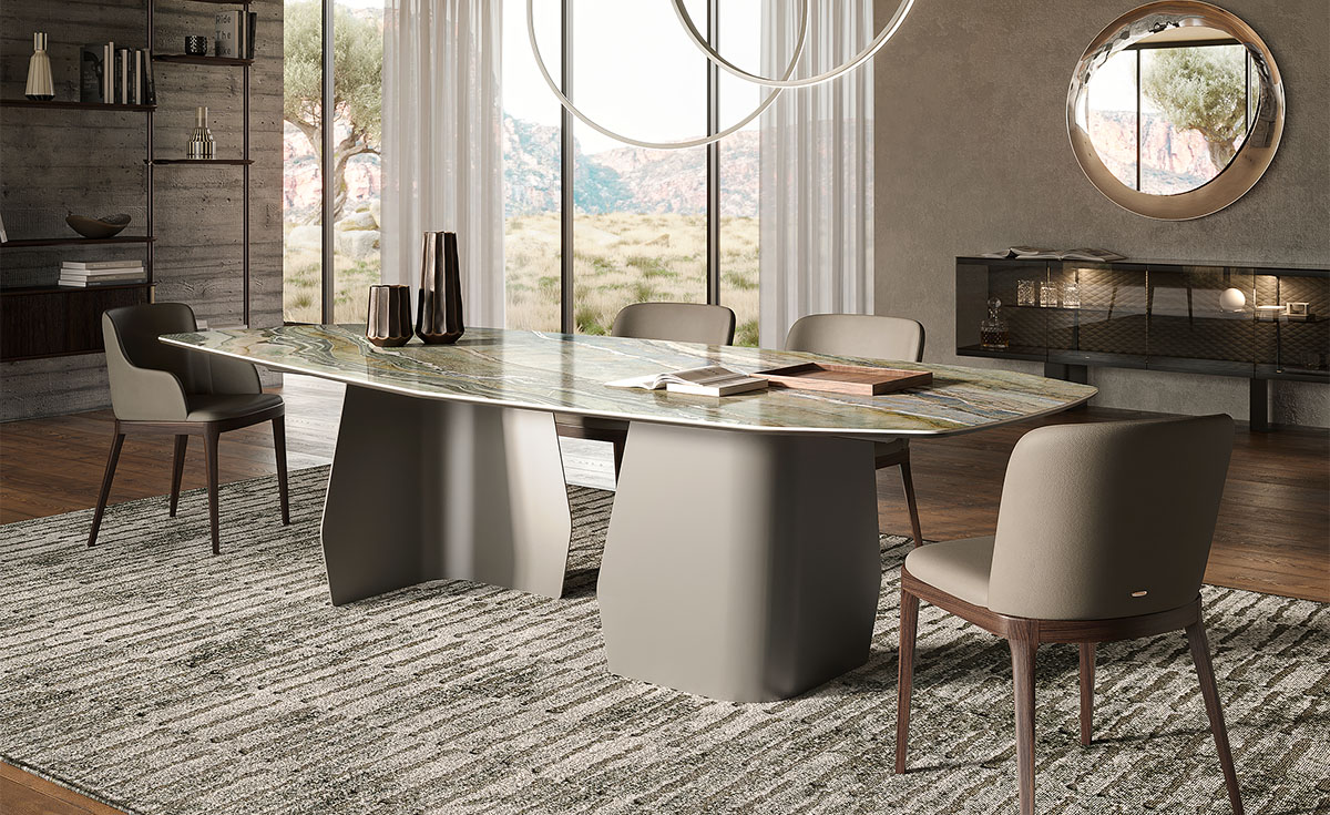 La table Senator Keramik signée Cattelan Italia incarne la rencontre parfaite entre innovation, élégance et maîtrise artisanale. Son allure monumentale transforme chaque salle à manger ou espace professionnel en un véritable lieu de prestige. Avec son plateau en céramique raffinée, disponible dans une large palette de finitions telles que Golden Calacatta, Portoro ou Sahara Noir, la Senator Keramik séduit par son éclat minéral et sa robustesse exceptionnelle. La céramique repose délicatement sur un piétement sculptural en acier embouti, proposé dans des finitions bronze ou titane, qui lui confèrent une présence architecturale spectaculaire.