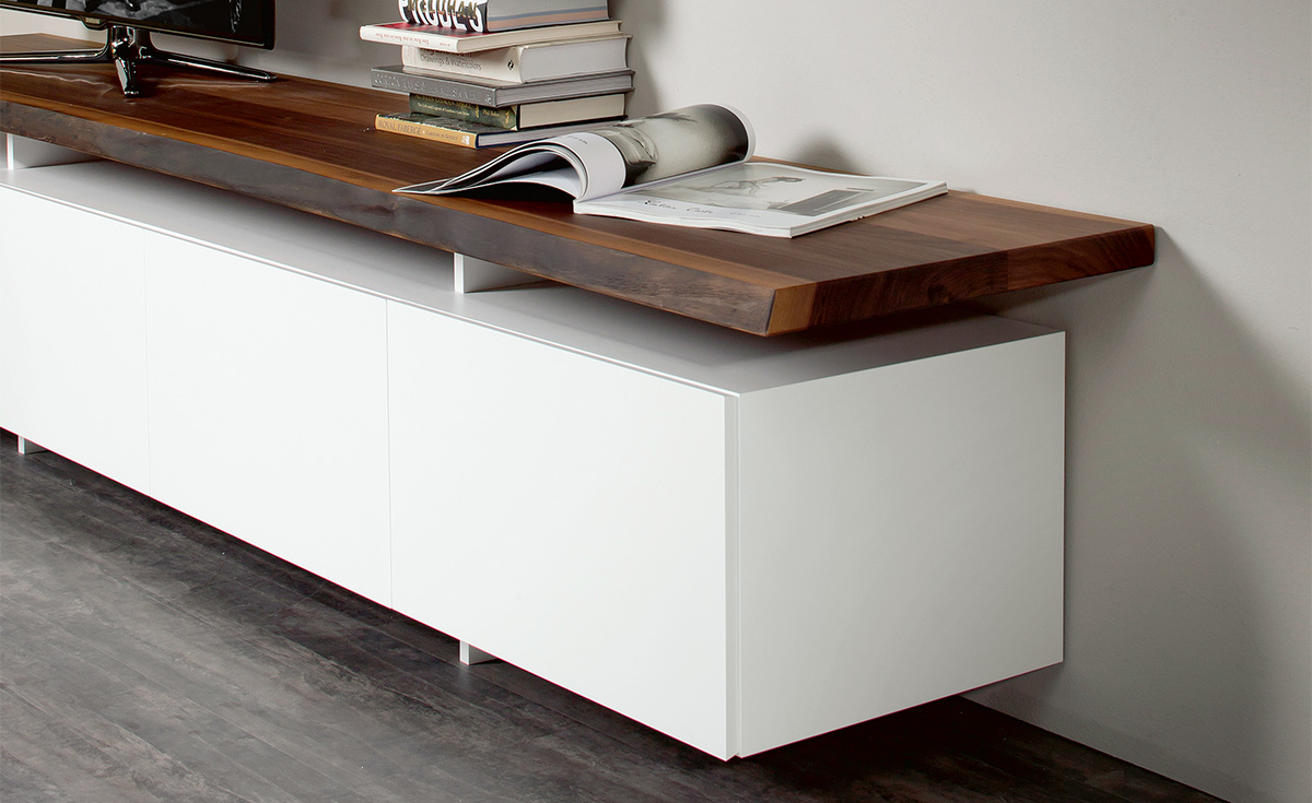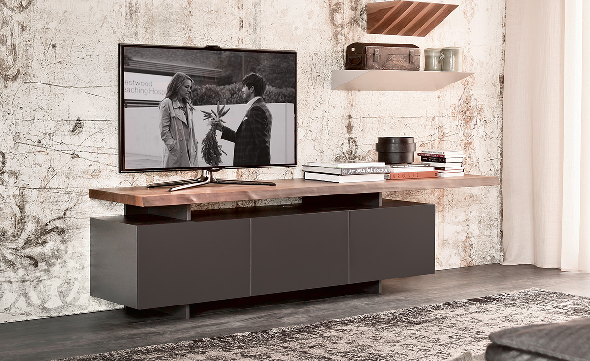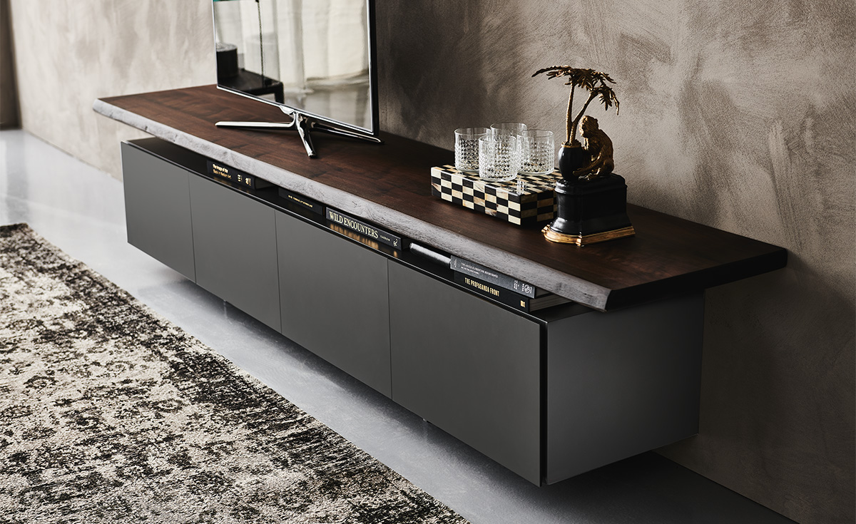 Ce meuble TV design haut de gamme se décline en deux dimensions (200cm et 250cm de longueur) pour une hauteur constante de 53cm et une profondeur de 45cm. Disponible avec 3 ou 4 portes en bois laqué blanc mat ou graphite, le Seneca propose un plateau en bois finement sélectionné ou dans une couleur assortie aux portes. La version avec plateau en bois présente un bord irrégulier qui lui confère une apparence tactile et naturelle, ajoutant une touche d’authenticité à l’ensemble.