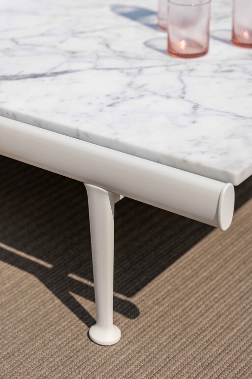 Le plateau en marbre Arabescato naturel révèle les veinures uniques de chaque bloc, conférant à chaque table une identité singulière. Sa structure en aluminium extrudé laqué, disponible dans les finitions Gesso et Basalto, assure une parfaite résistance aux intempéries tout en apportant une chaleur visuelle raffinée. Les pieds en aluminium moulé et peints à la poudre époxy complètent un ensemble durable et sophistiqué, conçu pour s’intégrer dans les collections Boundless Living Outdoor de Poltrona Frau.