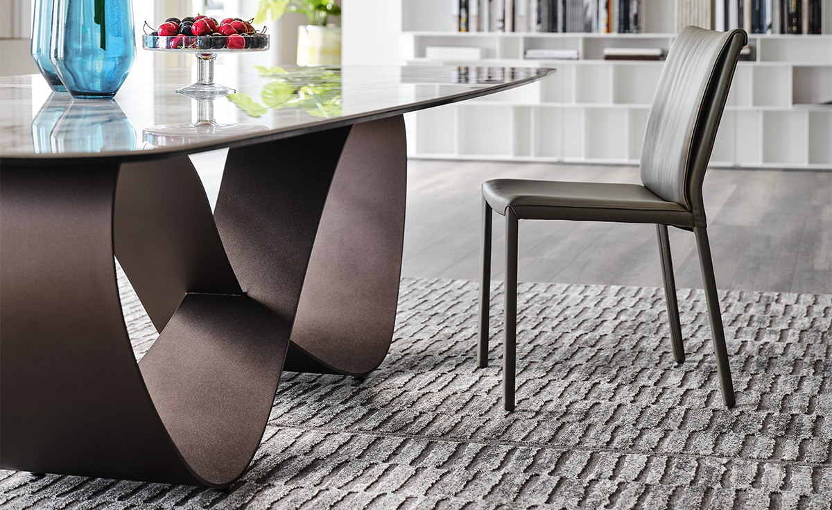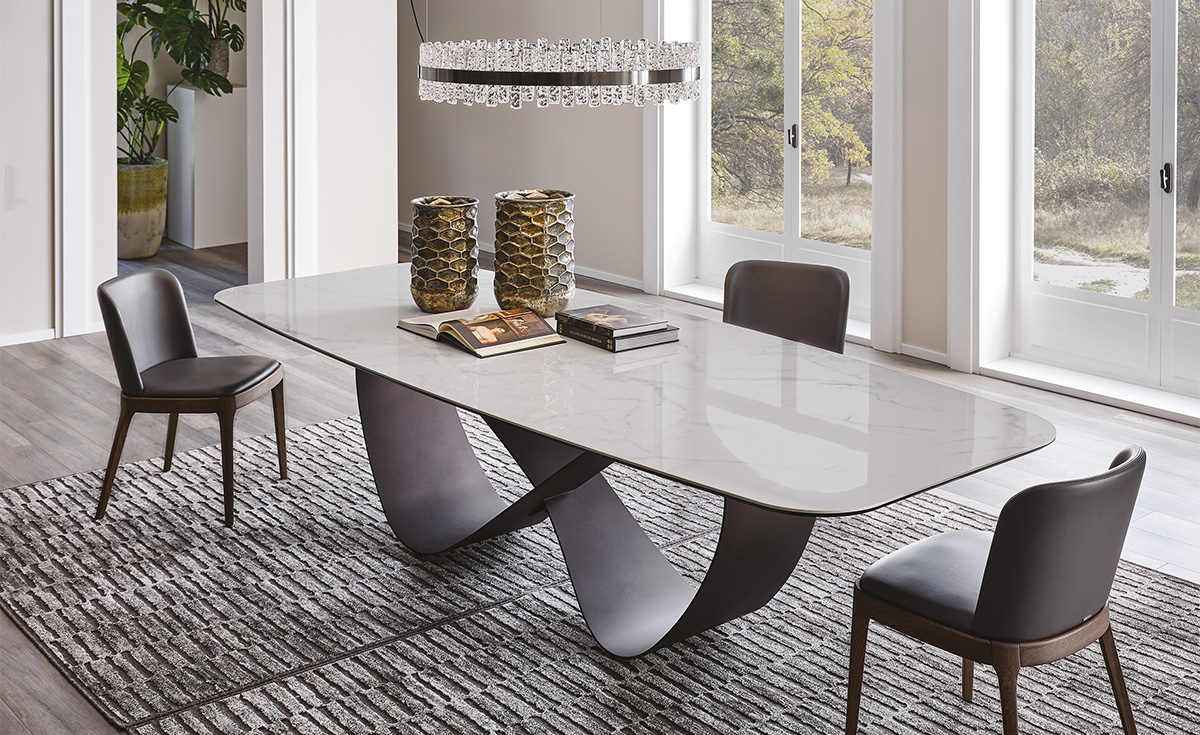 Le plateau en céramique Marmi, disponible en plusieurs nuances exclusives telles que Alabastro, Golden Calacatta, Portoro, Sahara Noir, Luxor et autres, repose délicatement sur la base. Le contraste entre la légèreté du plateau et la structure audacieuse de la base crée un effet visuel saisissant.