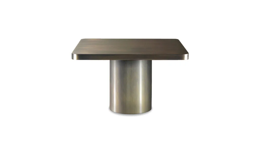 La version Tau 40 se distingue par sa base en laiton foncé brillant (105M), avec une partie inférieure en laiton mat (104M) et une plaque de jonction en acier poli. Le plateau en verre bronze de 10 mm d’épaisseur repose sur une plaque métallique assortie, soulignant la précision du travail artisanal et le souci du détail caractéristique de la marque italienne.