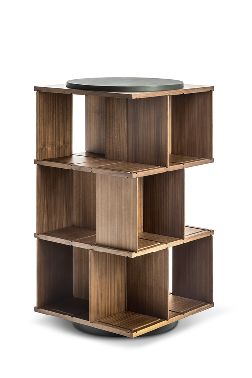 Bibliothèque Turner par Poltrona Frau : design Gianfranco Frattini, structure noyer Canaletto avec plateaux tournants. Bibliothèque centrale rotative haut de gamme pour livres précieux.