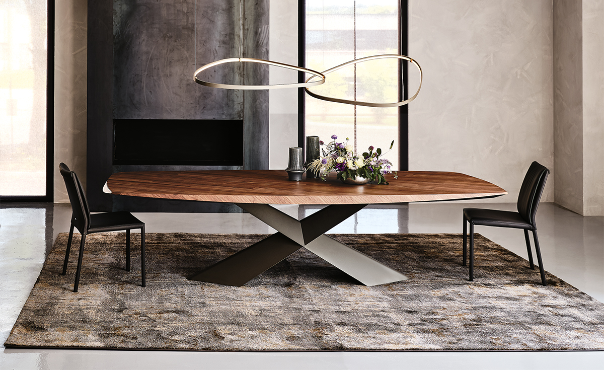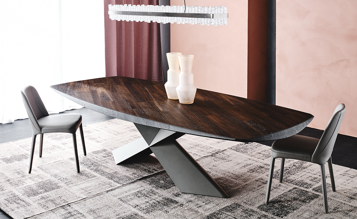 Tyron Wood de Cattelan Italia réunit élégance naturelle et architecture sculpturale dans une table de salle à manger d’exception. Sa base audacieuse en acier laqué embossé, disponible en finitions titanium, bronze, graphite ou noir, crée un contraste raffiné avec le charme chaleureux du bois massif. Cette combinaison de matériaux nobles donne à la pièce une allure à la fois moderne et intemporelle.