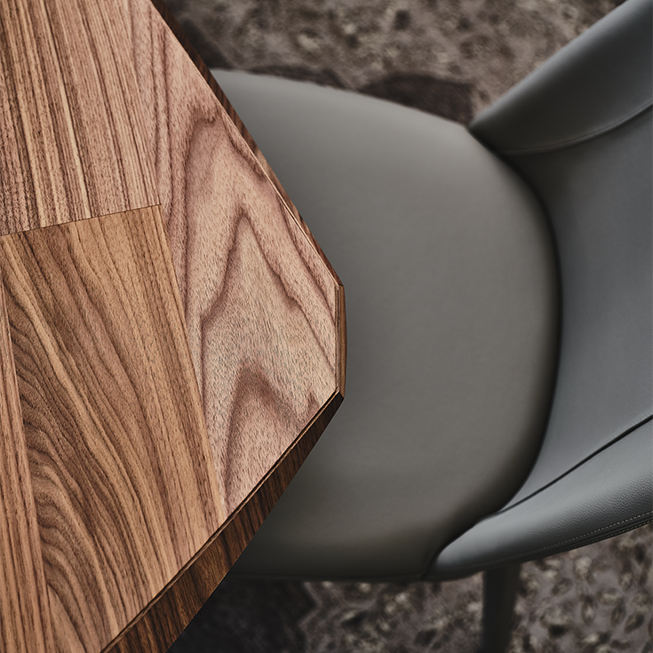 Le plateau est proposé dans plusieurs variantes raffinées : la version “S” avec bords irréguliers en bois massif, la version “B” avec plateau baril et bords inclinés, la “Y” qui associe deux essences contrastées, et enfin la prestigieuse version Masterwood, réalisée à partir de planches de noyer Canaletto ou de chêne brûlé disposées en diagonale. Chaque plateau révèle un travail artisanal minutieux, avec des bords obliques et arrondis qui subliment le veinage naturel du bois.