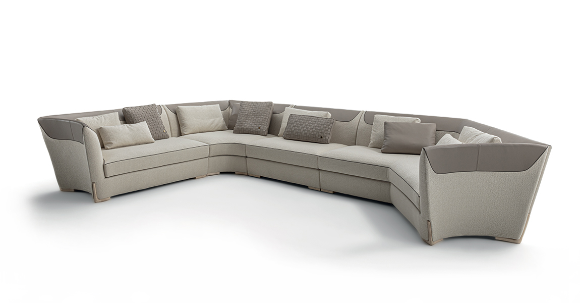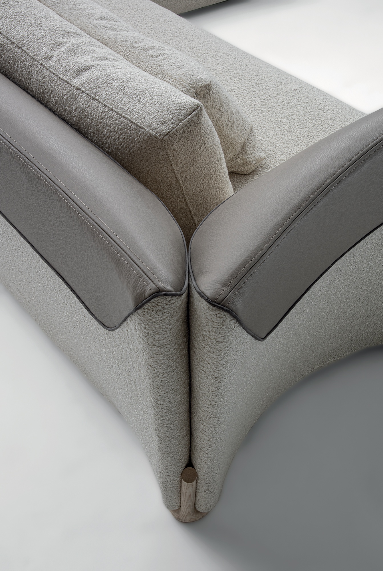 Vivaldi canapé de Vittoria Frigerio illustre parfaitement l’expertise artisanale de la maison italienne. Ce modèle combine harmonieusement le raffinement des formes, la douceur des lignes courbes et la richesse des matières pour créer une pièce d’exception au caractère à la fois contemporain et élégant. Son accoudoir massif et incurvé, enrichi d’un insert contrasté et d’un passepoil délicat, confère à l’ensemble une allure sculpturale et sophistiquée. La base repose sur des pieds en bois massif d’orme, incrustés dans la structure comme de véritables bijoux.