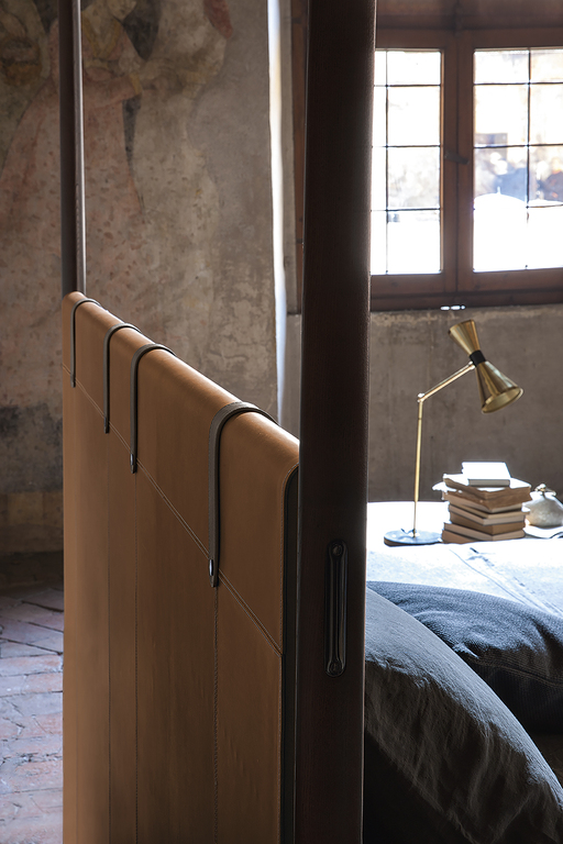 Le cadre, réalisé en tulipier, est entièrement revêtu de cuir Cuoio Saddle Extra ou Pelle Frau®, emblématiques de la qualité Poltrona Frau. La tête de lit, en hêtre massif avec panneaux en multiplis de bouleau, accueille deux coussins moelleux fixés par des sangles en cuir, offrant un confort visuel et tactile exceptionnel. Les détails métalliques, finition canon de fusil, ajoutent une touche de sophistication tout en assurant une solidité durable.