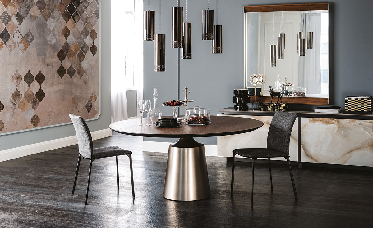 Le plateau en bois précieux, disponible en noyer Canaletto ou chêne brûlé, révèle des finitions artisanales qui témoignent du savoir-faire exceptionnel de la marque. Chaque détail est soigneusement travaillé pour sublimer la texture naturelle du bois, tout en offrant une surface résistante et agréable au toucher. Cette association entre matériaux nobles et structure métallique raffinée crée une harmonie parfaite entre solidité et élégance.