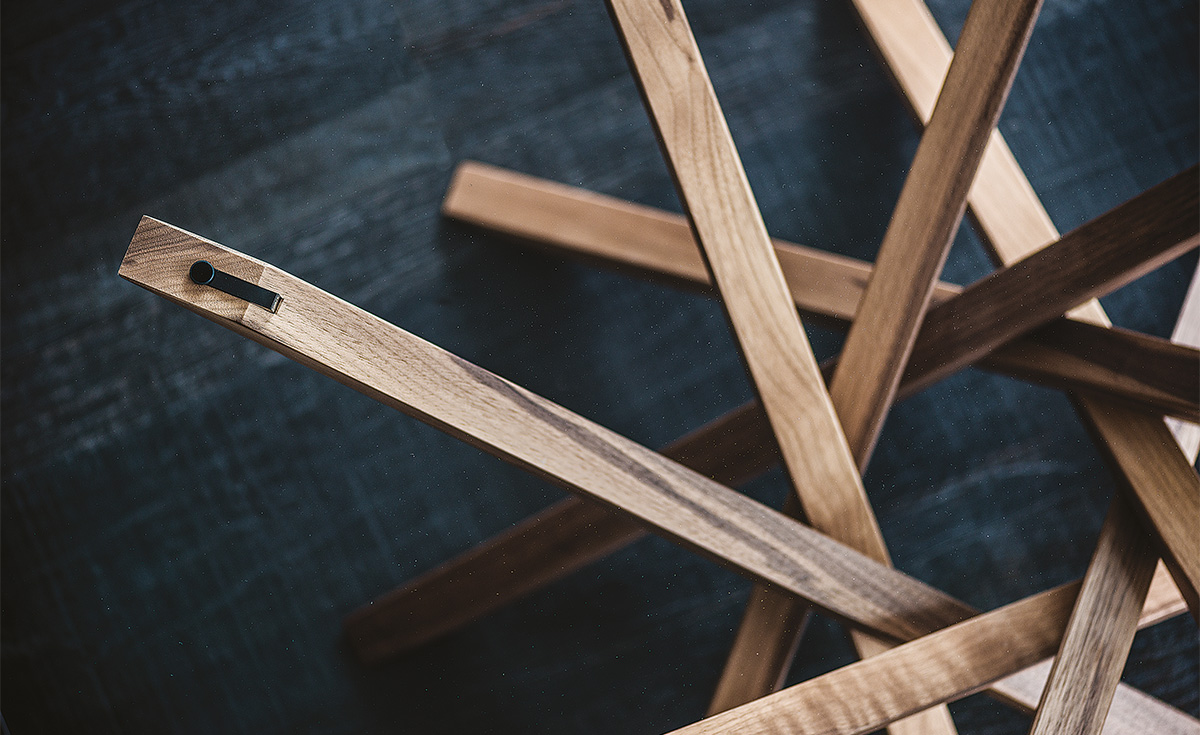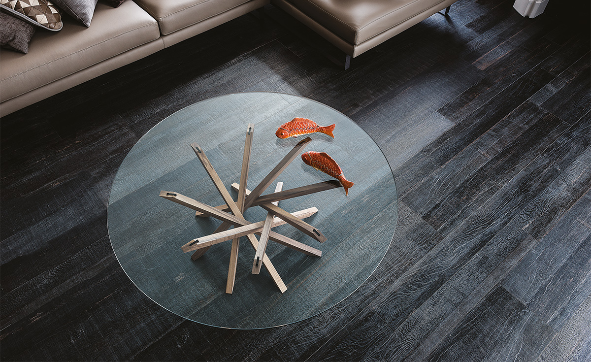 Cette table basse design haut de gamme se décline en plusieurs dimensions (rond ø80cm, ø100cm, ø120cm et carré 100x100cm, 120x120cm, 200x106cm) pour une hauteur constante de 38cm. La base est disponible en noyer Canaletto ou chêne brûlé teinté noyer, tandis que le plateau en verre transparent permet d’apprécier pleinement la beauté de la structure bois. Dans la version rectangulaire plus grande, la base est dédoublée, multipliant ainsi le charme de l’ensemble et créant un effet visuel spectaculaire.