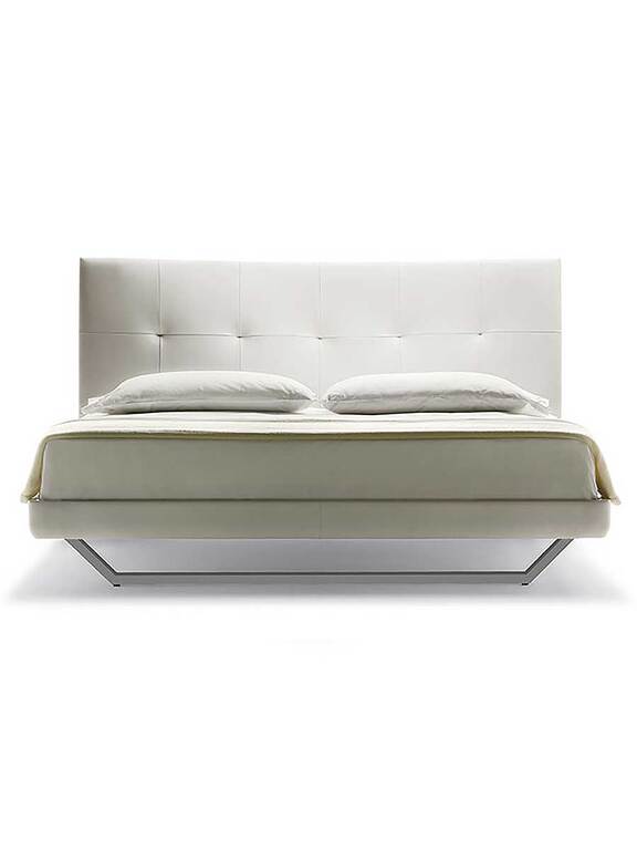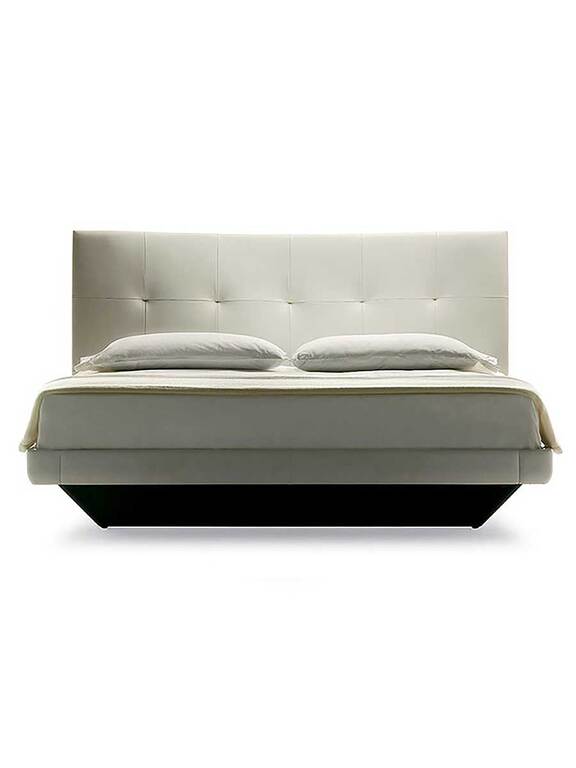 La base du lit est rembourrée de mousse de polyuréthane, reposant sur une structure en lattes de sapin pour les bords et en multiplis de peuplier pour le pied de lit. Les pieds avant sont en bois laqué noir ou en métal dans des finitions peint en noir, canon de fusil ou chromé, tandis que les pieds arrière prolongent la tête de lit jusqu’au sol, créant une silhouette harmonieuse et équilibrée.