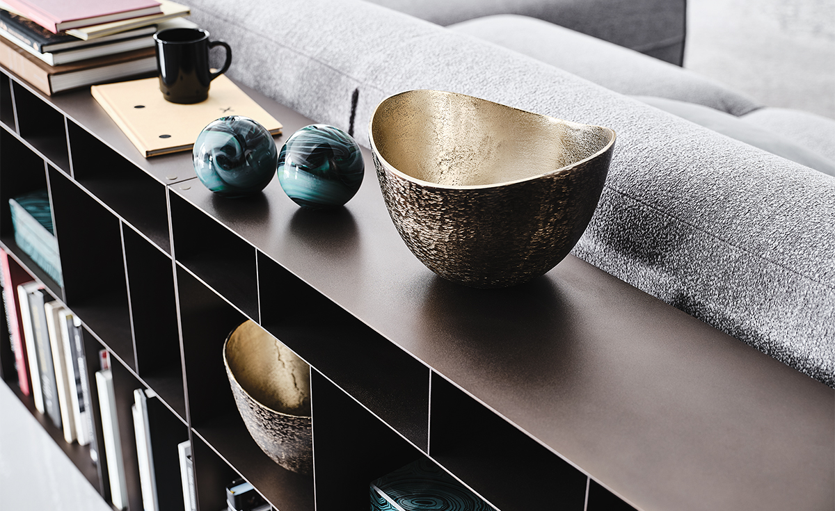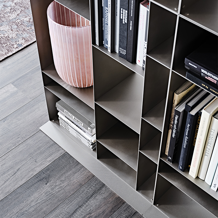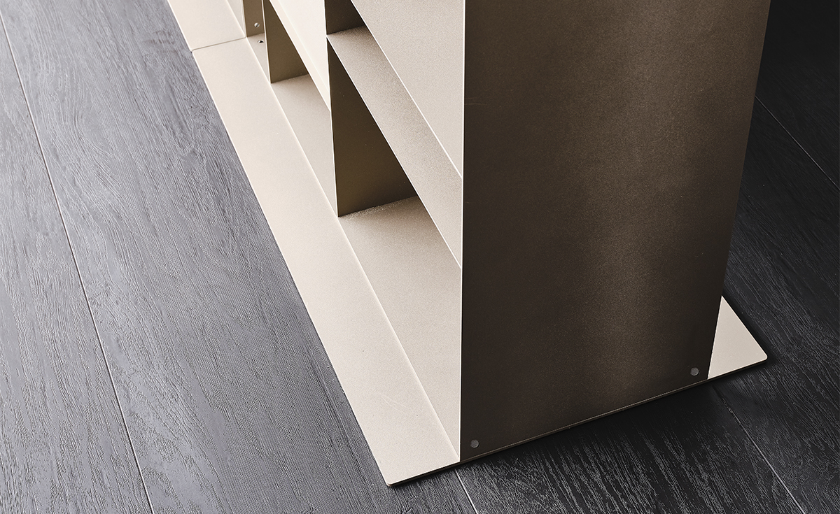 La finition métallique en acier laqué embossé, disponible en titane (GFM11), bronze (GFM18) ou perle (GFM70), apporte luminosité et valeur à cette bibliothèque design haut de gamme. Chaque unité peut être assemblée côte à côte ou empilée, avec ancrage mural nécessaire si le ballast optionnel n’est pas fixé, garantissant stabilité et sécurité.