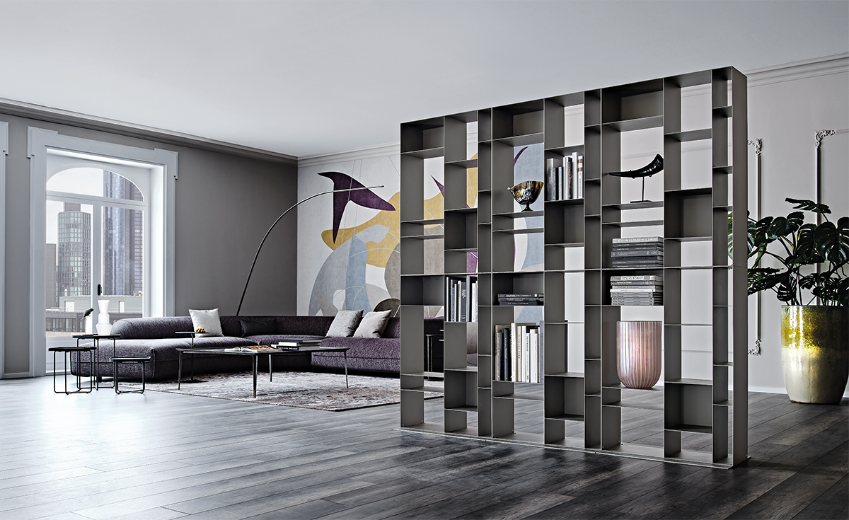 Avec ses dimensions de 70x26x100 cm par module, la bibliothèque Latitude excelle dans diverses configurations. En composition verticale, elle met en valeur la hauteur d’une colonne, tandis qu’en agencement rectangulaire, elle devient une séparation room divider parfaite qui permet de voir à travers. En composition horizontale basse, elle se transforme en meuble de service idéal, à placer contre un mur, derrière un canapé ou au pied d’un lit.