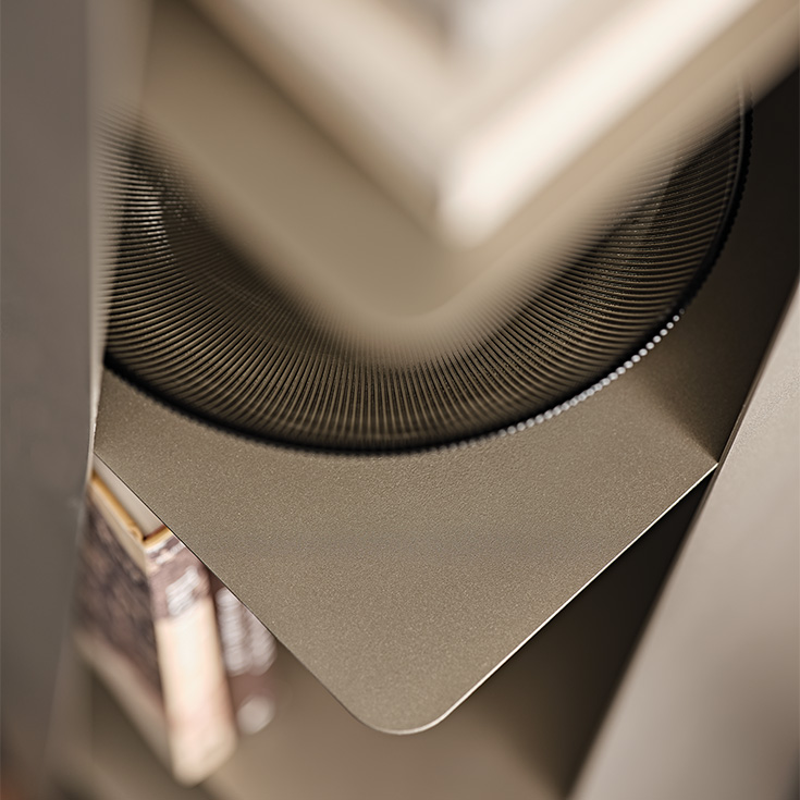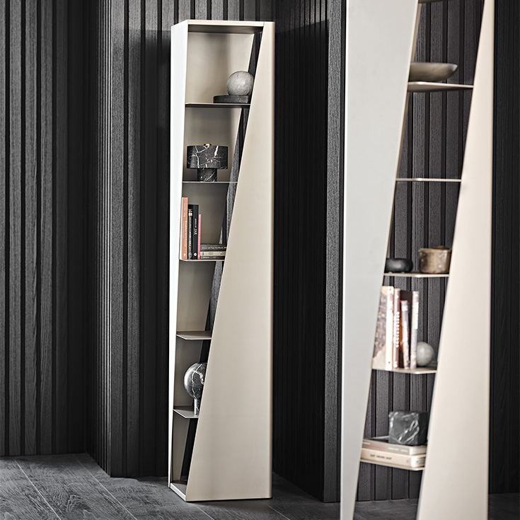 Choisir cette bibliothèque design haut de gamme, c’est opter pour une pièce qui insuffle de la lumière à l’environnement. L’effet optique créé par les découpes diagonales tend à adoucir les angles et donne l’impression d’une bibliothèque spirale sinueuse. Disponible en acier laqué embossé titane (GFM11) ou bronze (GFM18), chaque finition apporte une touche d’ultra-modernité à votre intérieur.
