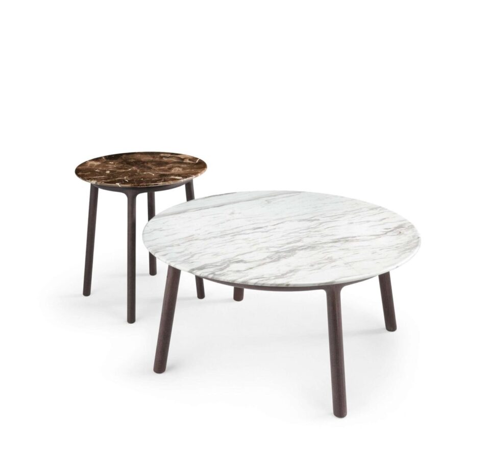 Plateau : en noyer Canaletto (NC) ou chêne brûlé (RB), avec insert en céramique Marmi dans plusieurs finitions luxueuses (Golden Calacatta, Portoro, Sahara Noir, etc.).
