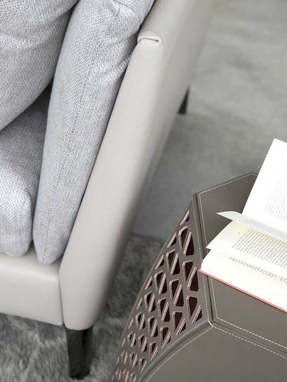 Le design harmonieux résulte d’un équilibre subtil entre différents matériaux : une coque rigoureuse et essentielle revêtue de cuir Pelle Frau® contraste élégamment avec une assise confortable et profonde enrichie de coussins moelleux déhoussables en tissu. La structure en hêtre et peuplier sec, avec suspension par sangles élastiques et rembourrage en plumes d’oie, garantit un confort exceptionnel. Le profilé en acier finition canon de fusil crée une décoration légère à la jonction entre accoudoir et dossier.