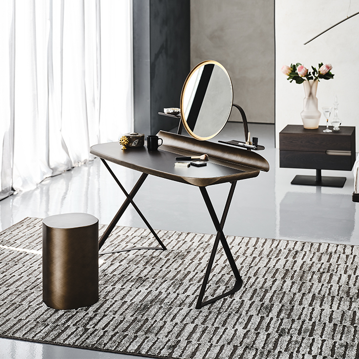 Coiffeuse design haut de gamme signée Cattelan Italia, la Cocoon Trousse Leather est une console maquillage compacte et polyvalente, pensée pour les espaces contemporains exigeants. Elle combine une base en acier laqué gaufré (titane, bronze ou noir) avec un plateau revêtu de cuir, et un profil inférieur arrondi en Brushed Bronze ou Brushed Grey doté d’un plateau rainuré pratique.