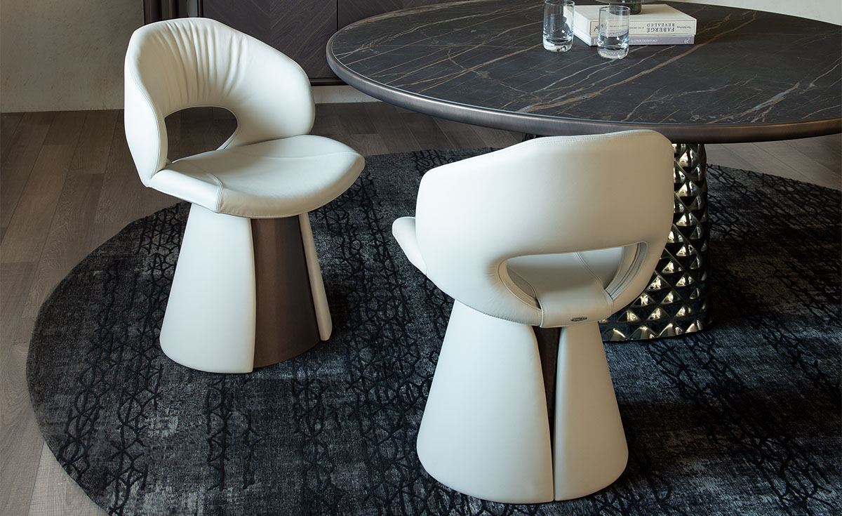 Disponible dans une large palette de cuirs et de similicuirs haut de gamme, ainsi qu’en différentes finitions de structure, comme le titane ou le bronze laqué gaufré, la Dafne s’adapte à toutes les ambiances. Conçue comme un petit trône contemporain, elle sublime la salle à manger ou tout espace élégant grâce à son allure majestueuse et son confort enveloppant. Disponible chez D-Style Interior.